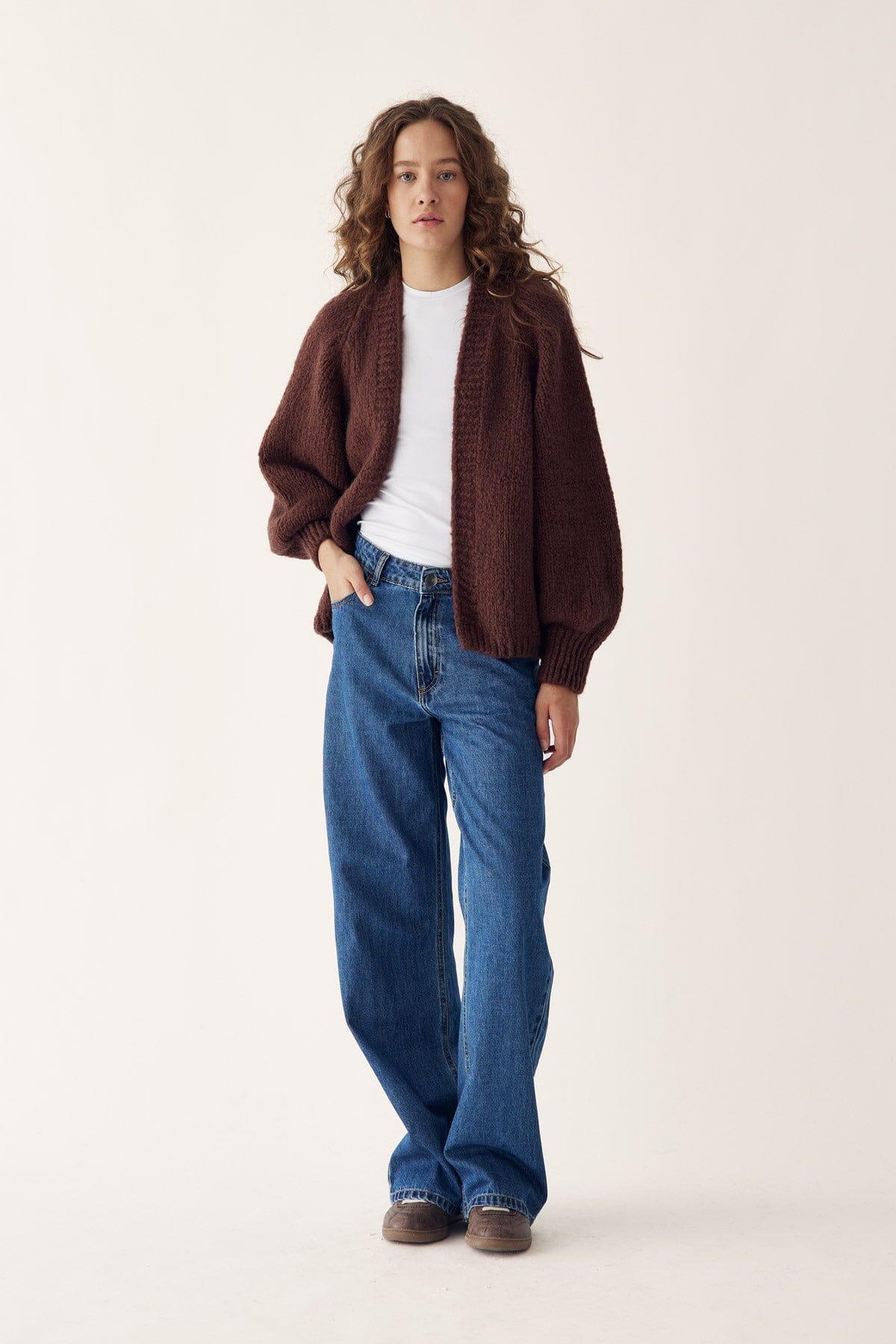 Cardigan marron foncé de Noella en un mélange de matériaux doux avec de la mohair et de la laine. La coupe ample et les longues manches offrent beaucoup d'espace pour le style en couches.