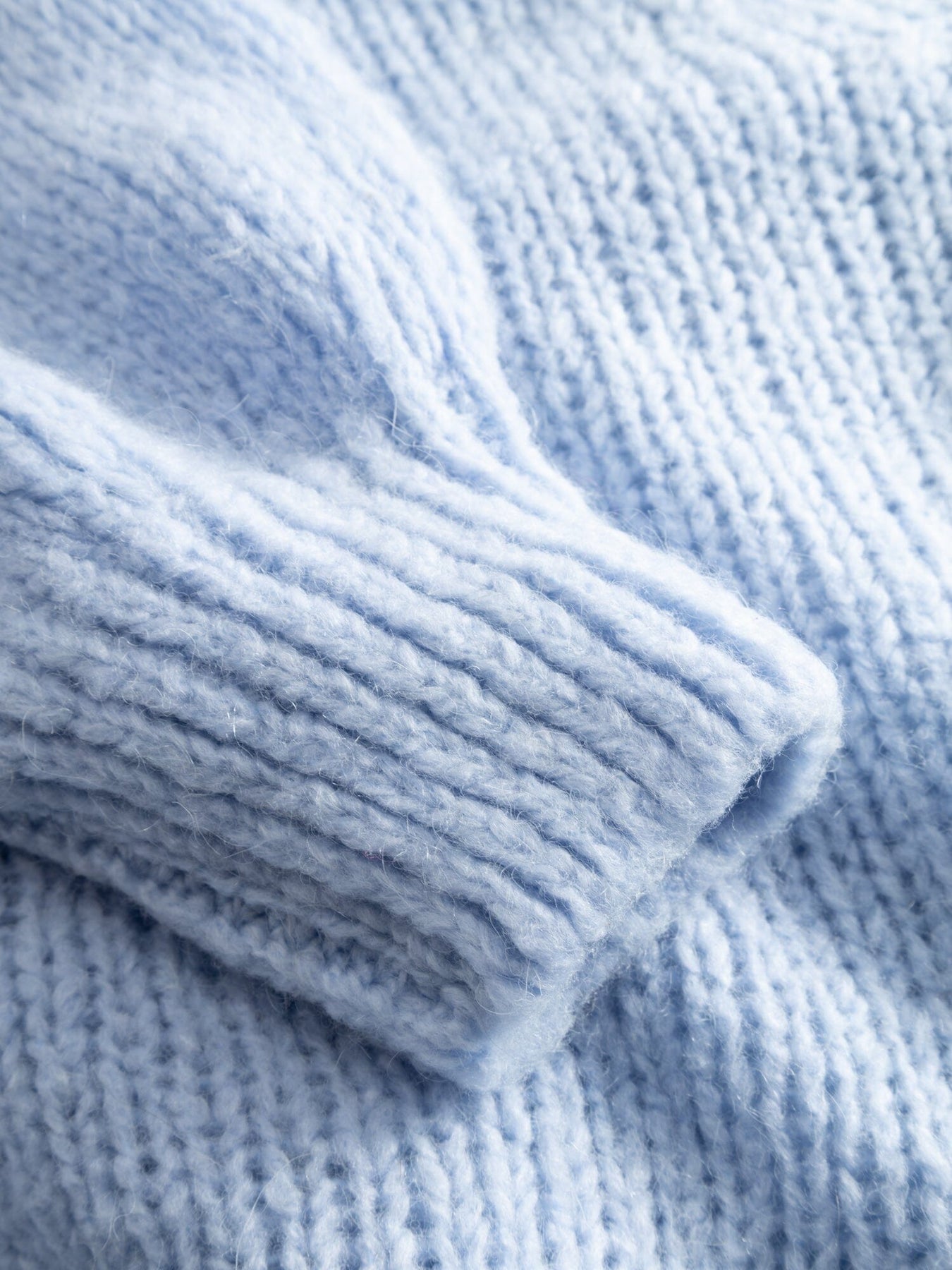 Cardigan tricoté bleu clair de Noella avec des manches bouffantes et une silhouette ample. Le tricot doux a une ouverture frontale sans fermeture et un col rond.