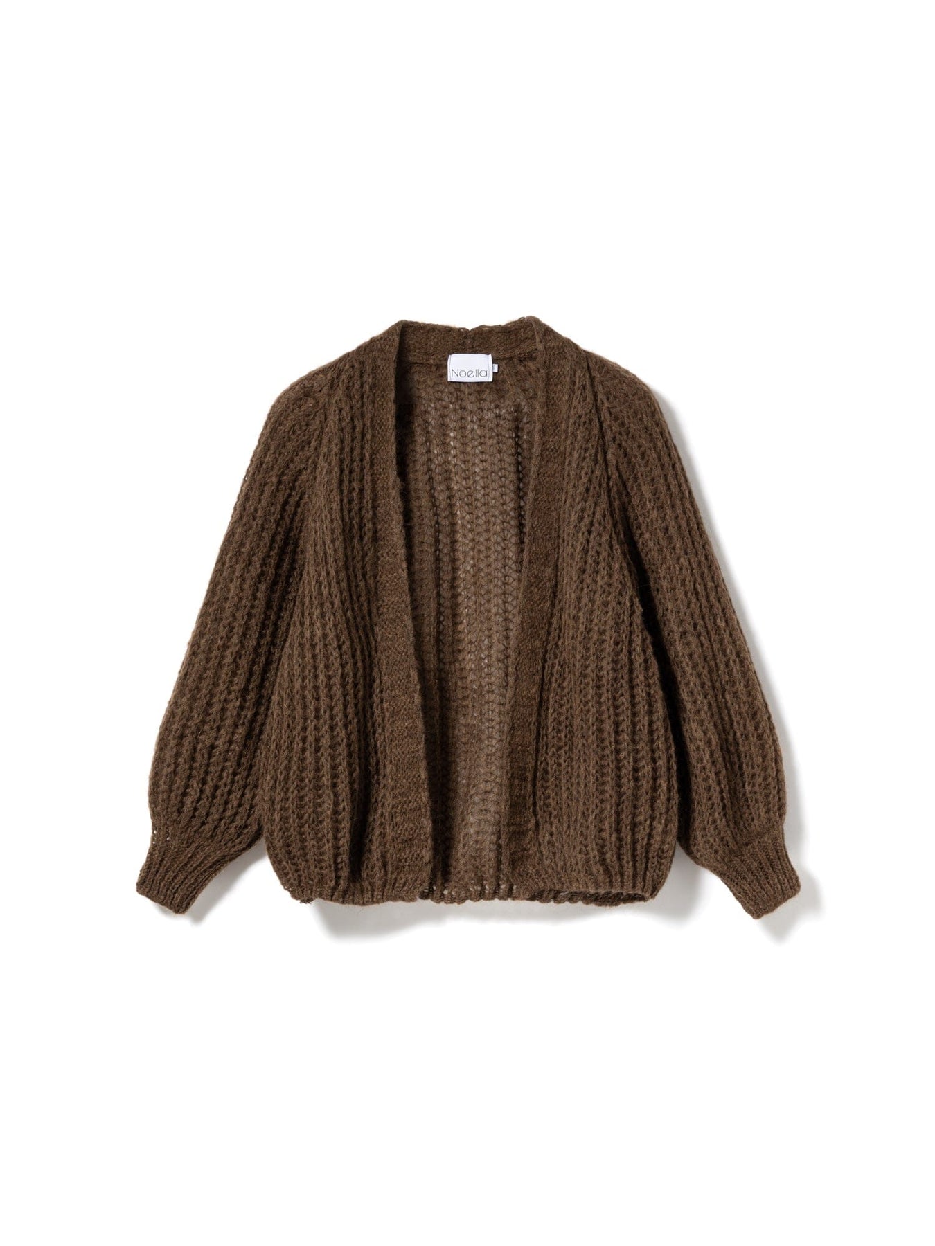 Cardigan en tricot brun de Noella avec un motif de structure ouvert. Le modèle ample a des manches en ballon et une devant ouvert sans fermeture. Il est tricoté dans une nuance de brun chocolat mélangé.