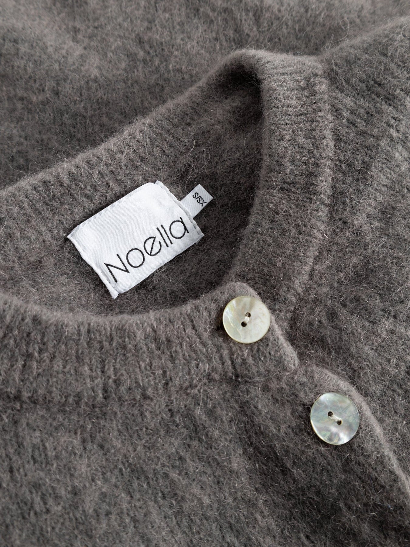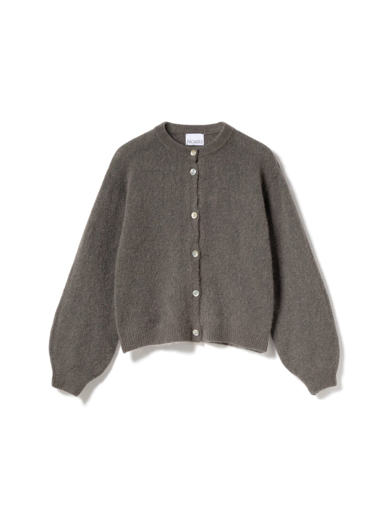 Cardigan tricoté de Noella en brun café. Il a un col rond, des boutons à l'avant et des manches larges avec un léger volume. Le matériau est doux et fluffy avec une sensation chaleureuse.