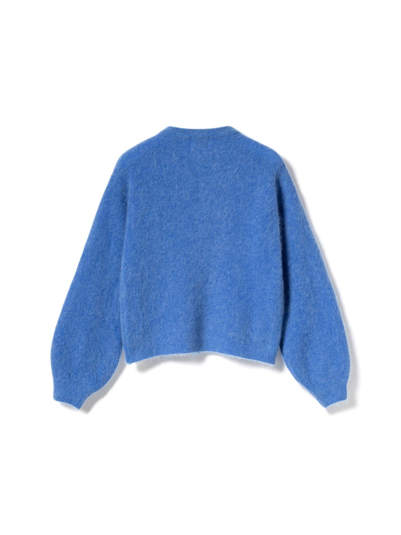 Cardigan tricoté de Noella dans une nuance de bleu clair. Il a un col rond et une fermeture à boutons à l'avant avec des boutons clairs. Les manches ballon et la longueur courte donnent au cardigan un caractère distinctif.
