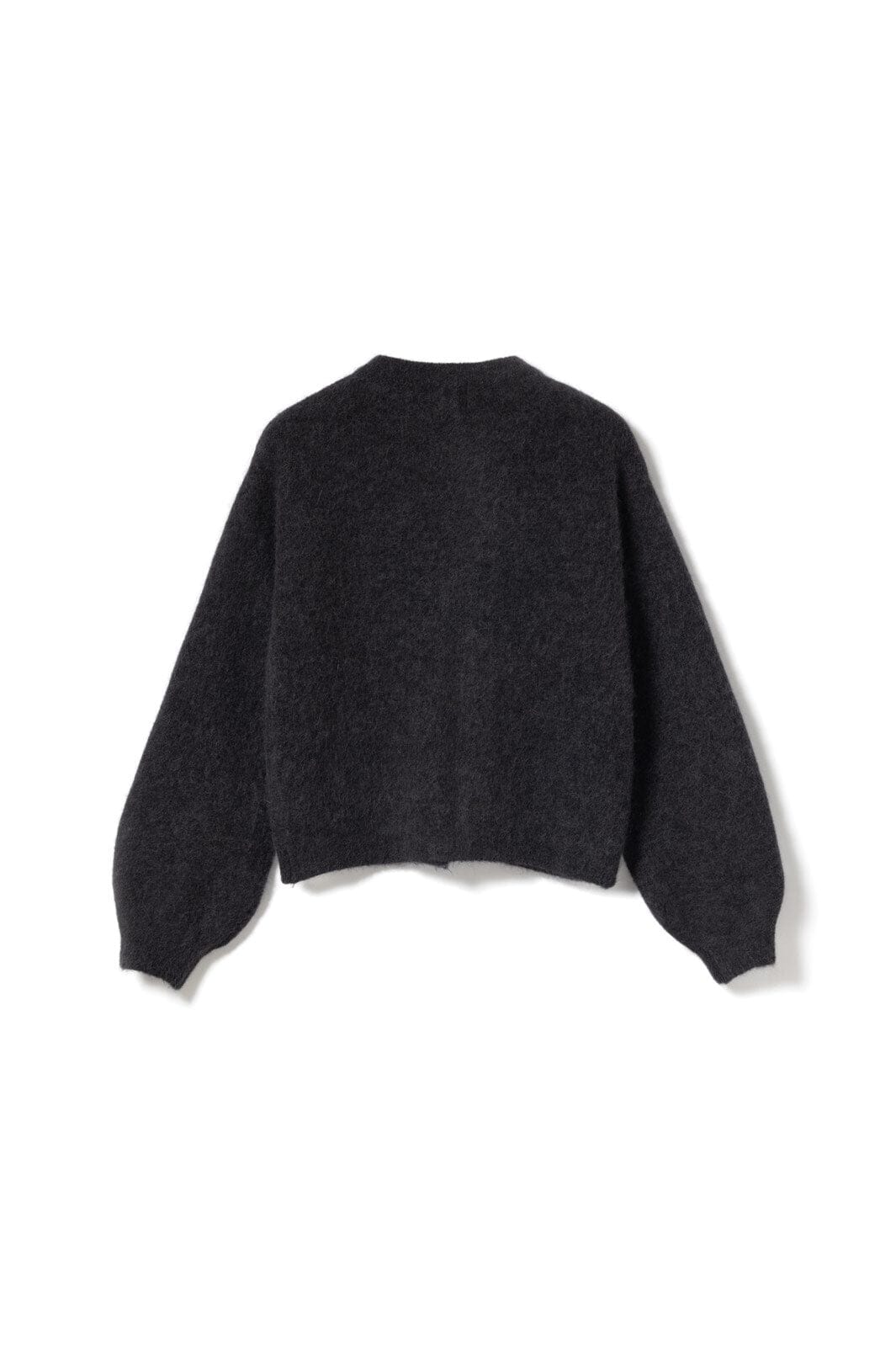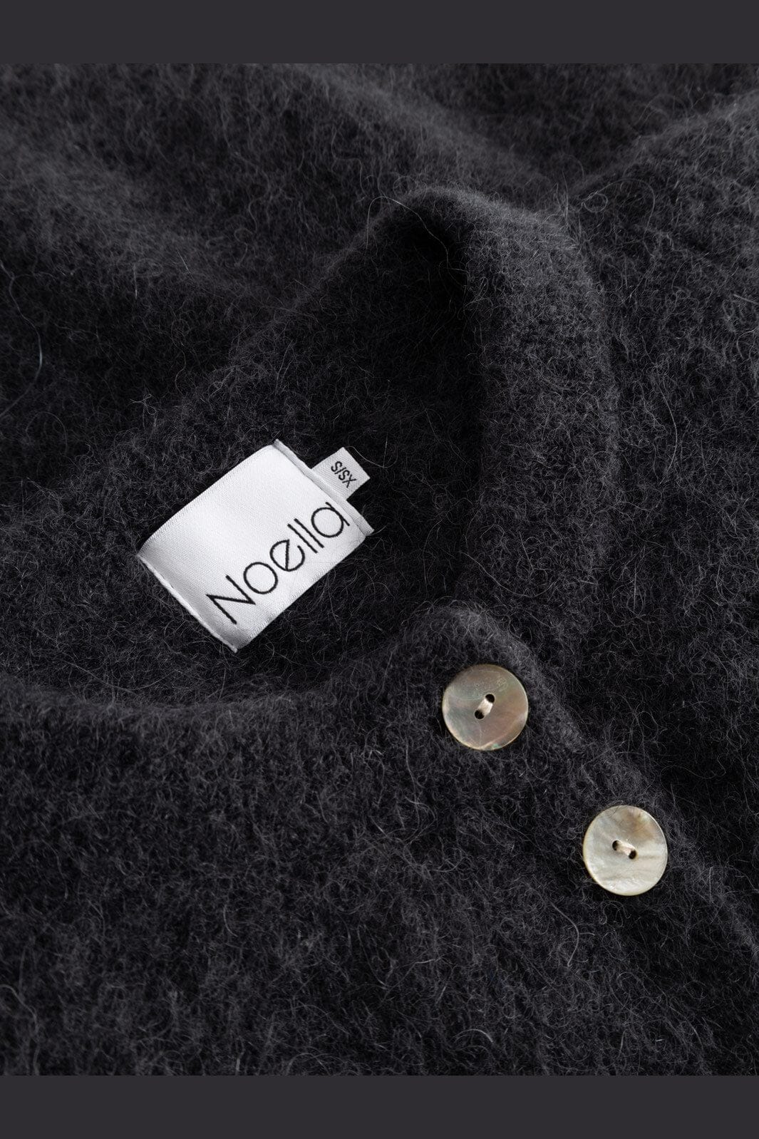 Cardigan en tricot gris foncé de Noella avec des manches bouffantes et des boutons en perles. La coupe ample et le mélange de matériaux doux offrent un cardigan confortable pour le quotidien.