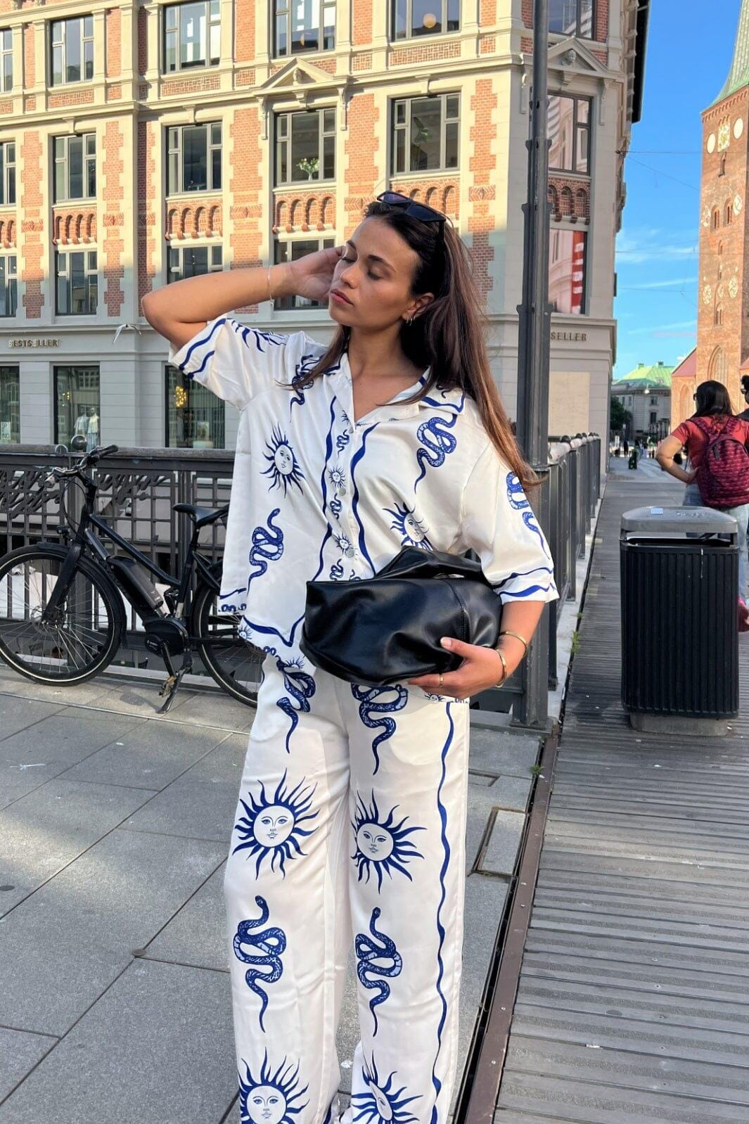 Chemise de Noella avec un motif serpent et soleil bleu sur fond blanc. Le modèle ample a des manches courtes et un col de chemise classique avec fermeture à boutons à l'avant.