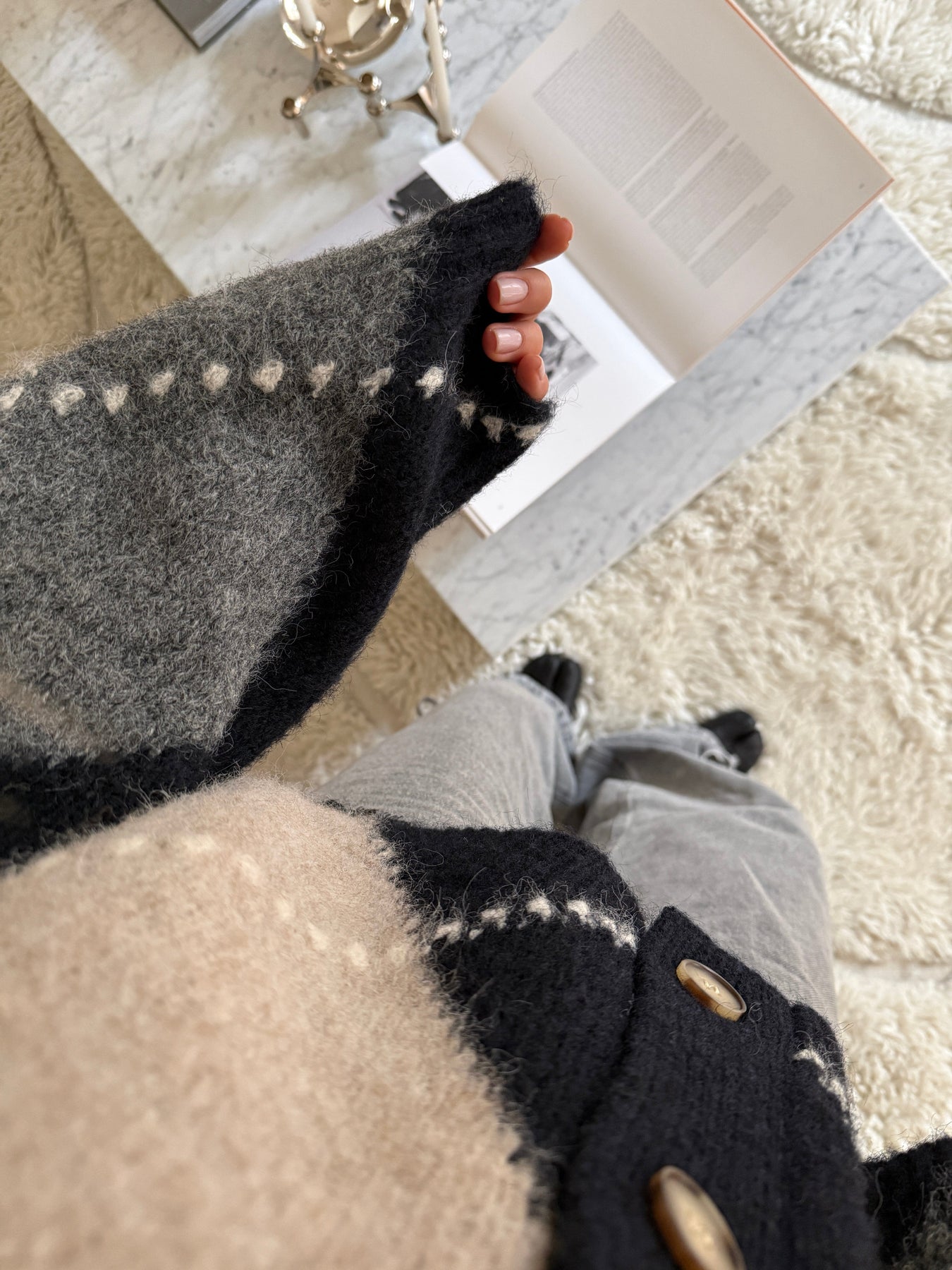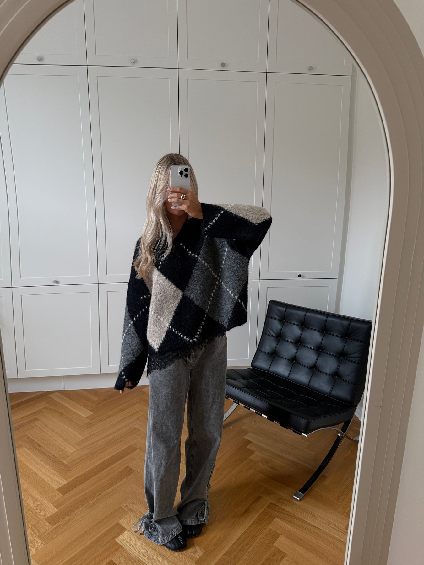 Pull en tricot de Noella avec de grands motifs en forme de diamant en bleu marine, gris et beige. Il a un col en V et des manches longues avec une coupe ample.