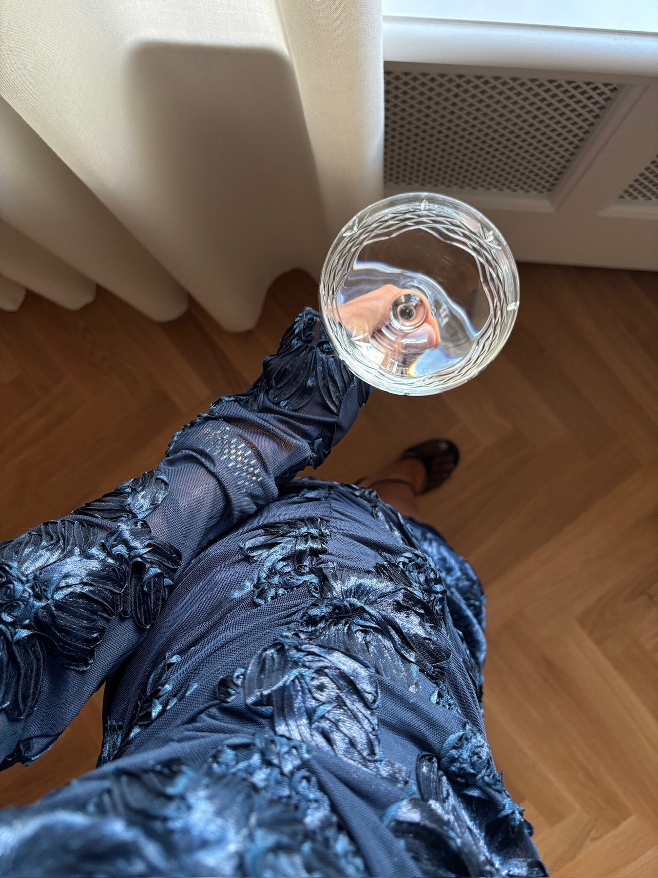 Robe bleu marine de Noella avec motif floral 3D. La robe a une coupe ajustée et des manches longues. Le tissu en mesh extensible avec broderie et volants donne à la robe une expression unique.