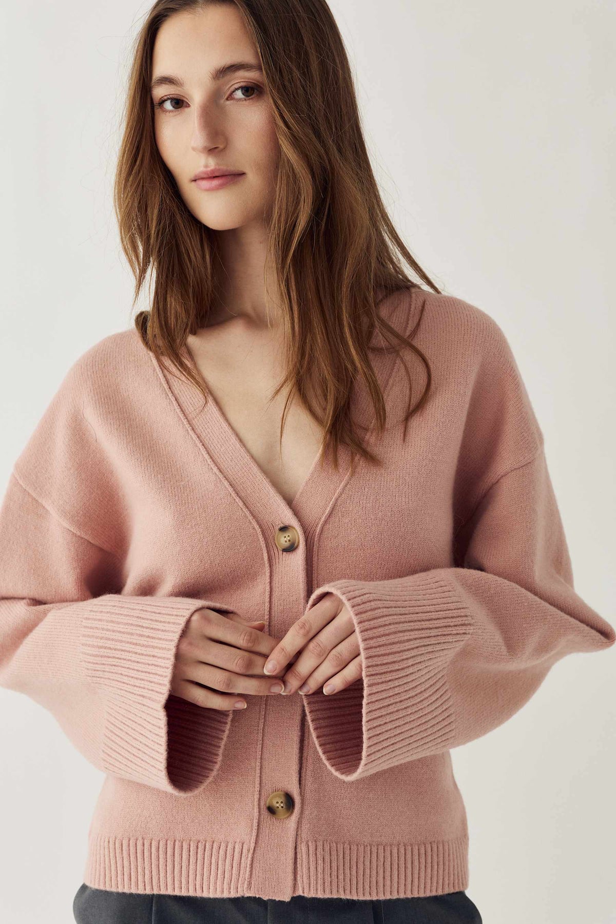 Cardigan en maille de Noella, de couleur rose. Il présente un col en V, une coupe ajustée et des manches volumineuses avec poignets côtelés.