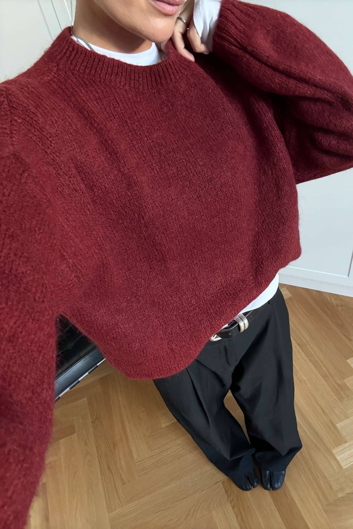 Pull en maille Noella de couleur rouge foncé. Composé de 57 % polyester, 29 % polyamide, 7 % viscose et 7 % laine.