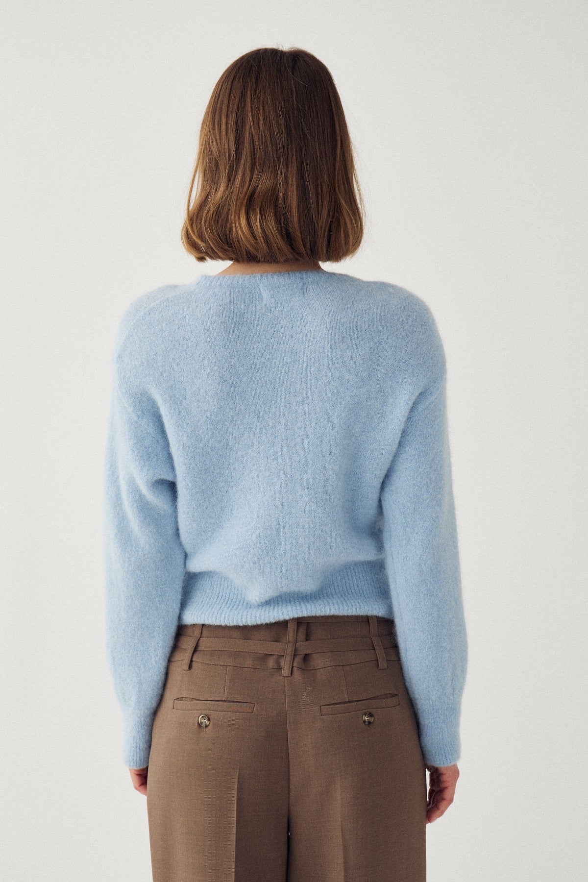 Cardigan tricoté de Noella dans une nuance bleu clair. Le cardigan présente un mélange de matières doux à base d’alpaga et de laine.