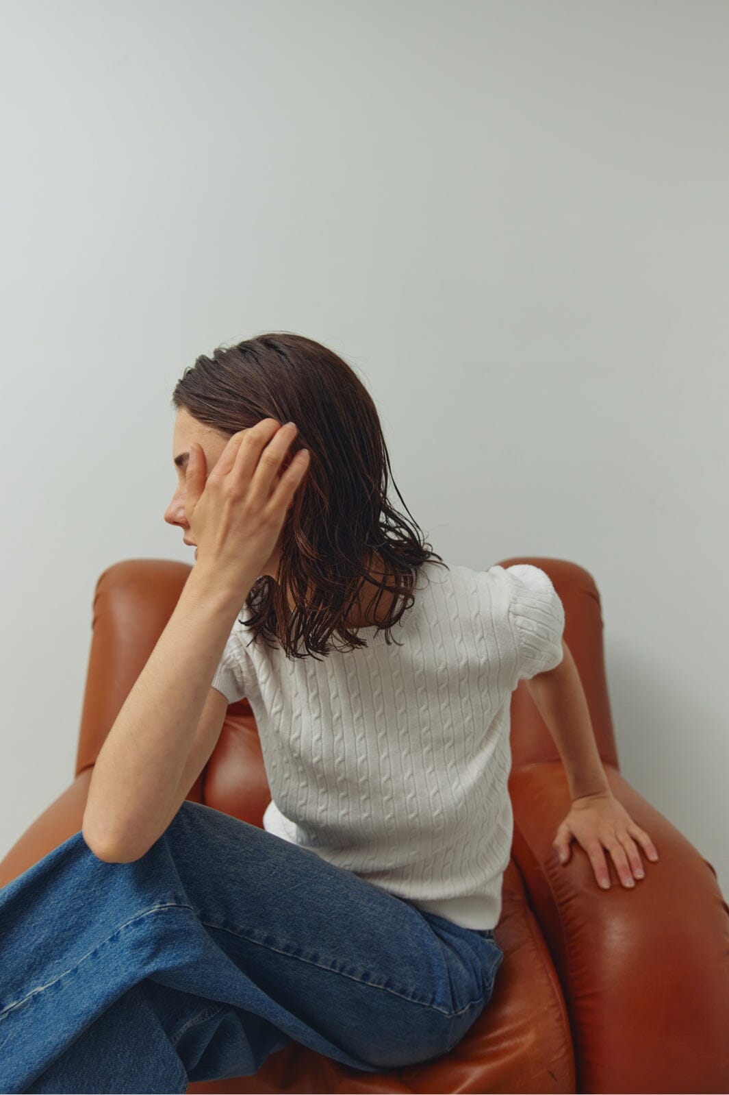 Pull torsadé de Noella dans une nuance écru. Le pull possède des manches courtes et une encolure ronde.