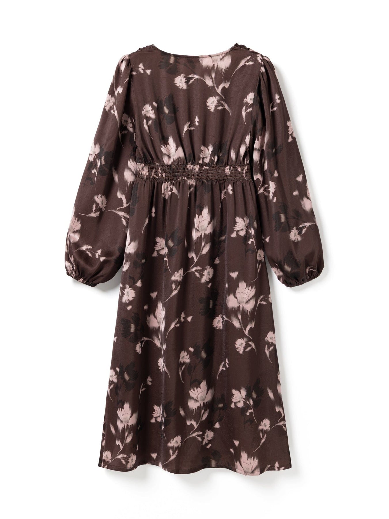 Robe de Noella dans des nuances de bordeaux avec un imprimé floral dans des tons rouges et bruns. La robe a des manches longues, un décolleté en V avec des détails de boutons et une taille marquée.