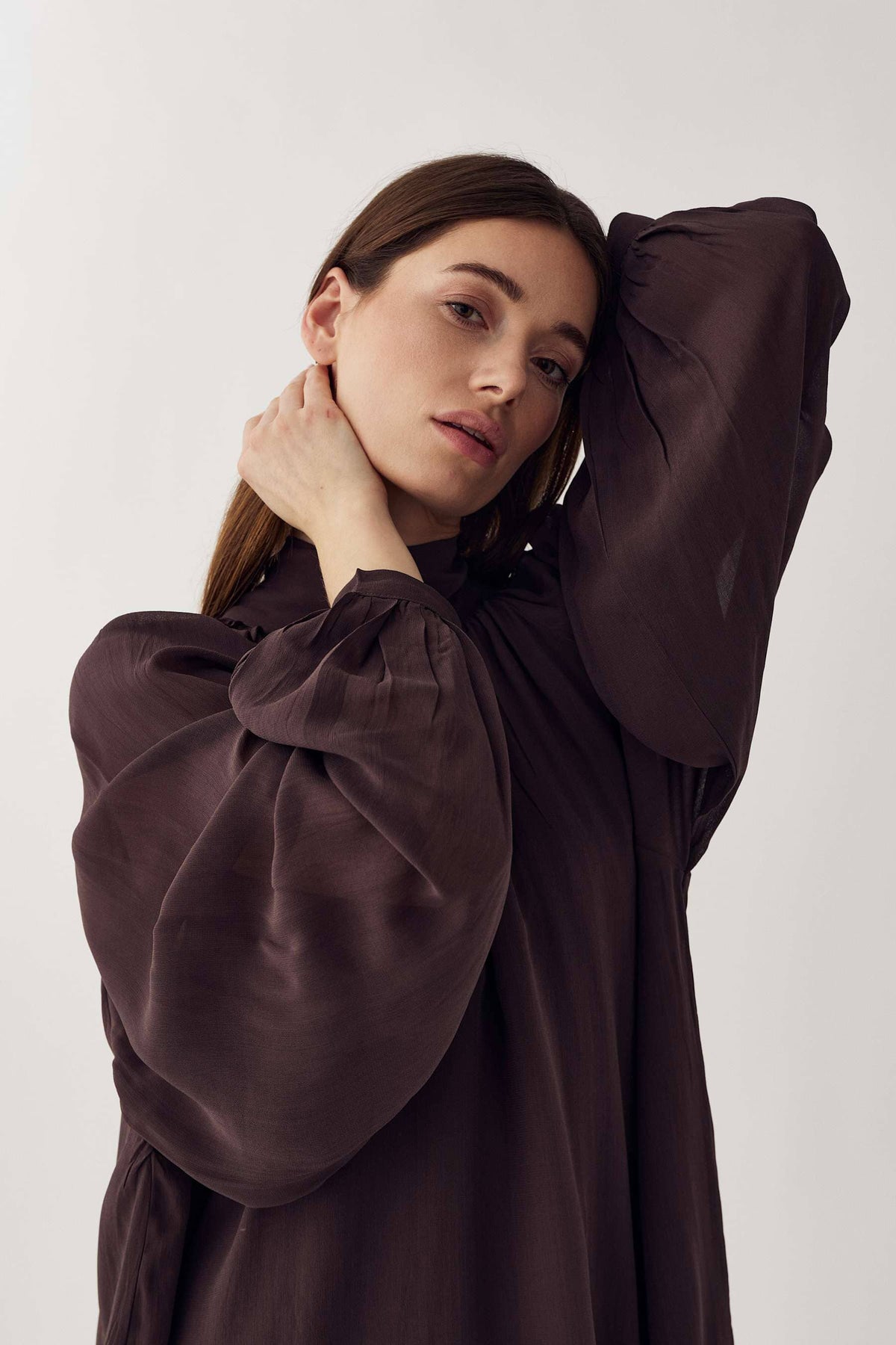 Robe marron chocolat de Noella, confectionnée en 100 % viscose. La robe présente un col montant avec nœud et des manches longues à poignets élastiques.