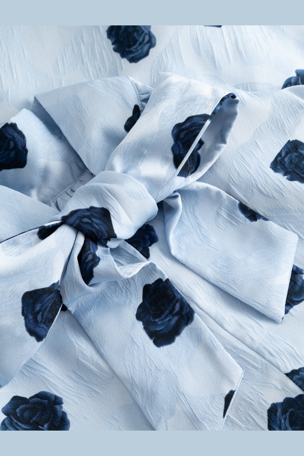 Robe Noella bleu clair avec imprimé fleuri bleu foncé. La robe possède des manches longues, un col montant avec nœud et une coupe ample.