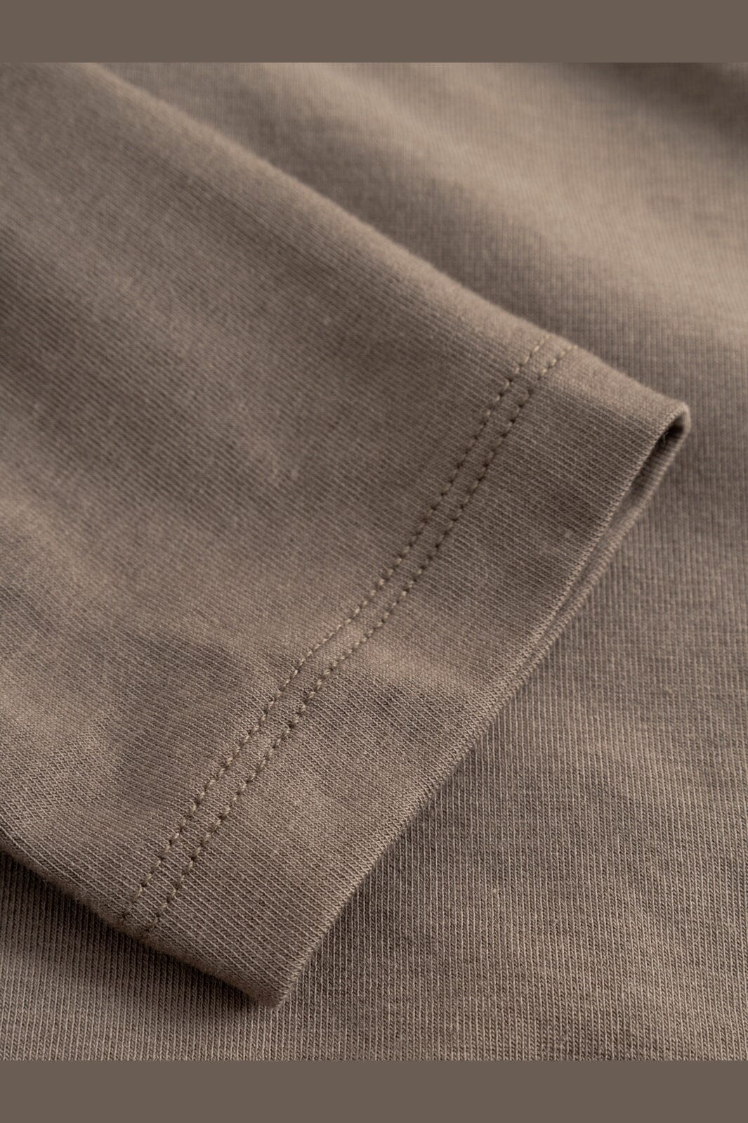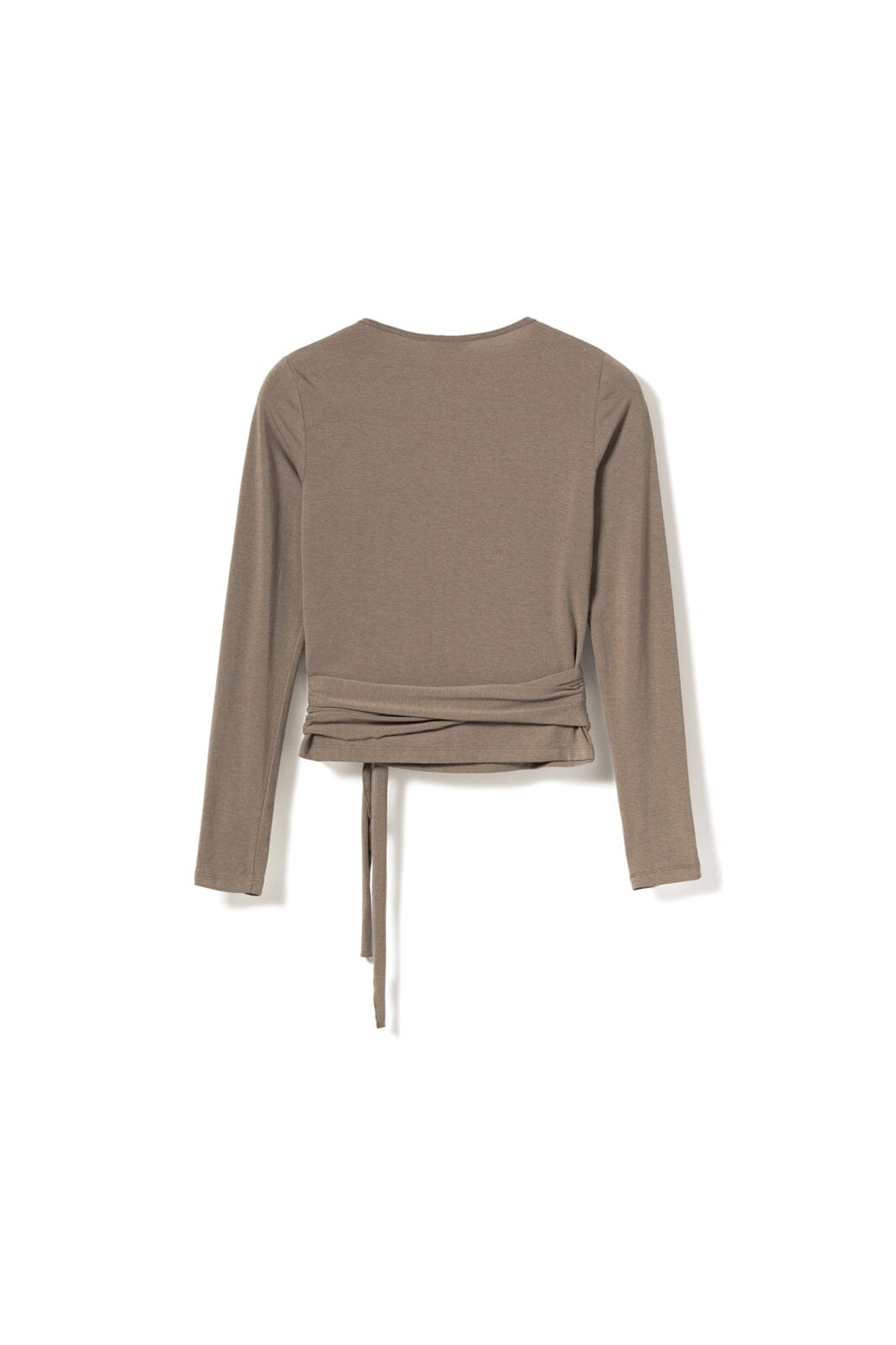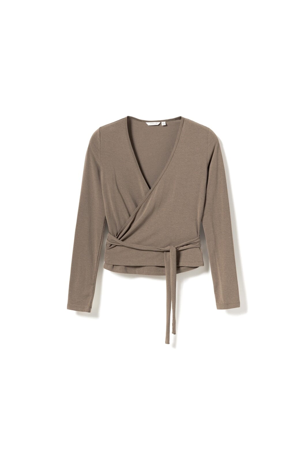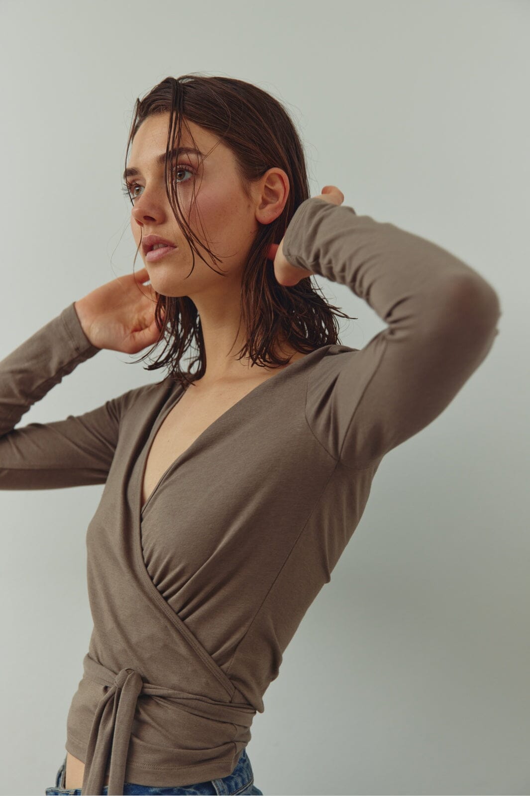 Haut de Noella avec design portefeuille dans une nuance brun gris. Le haut possède des manches longues et un lien à nouer à la taille.