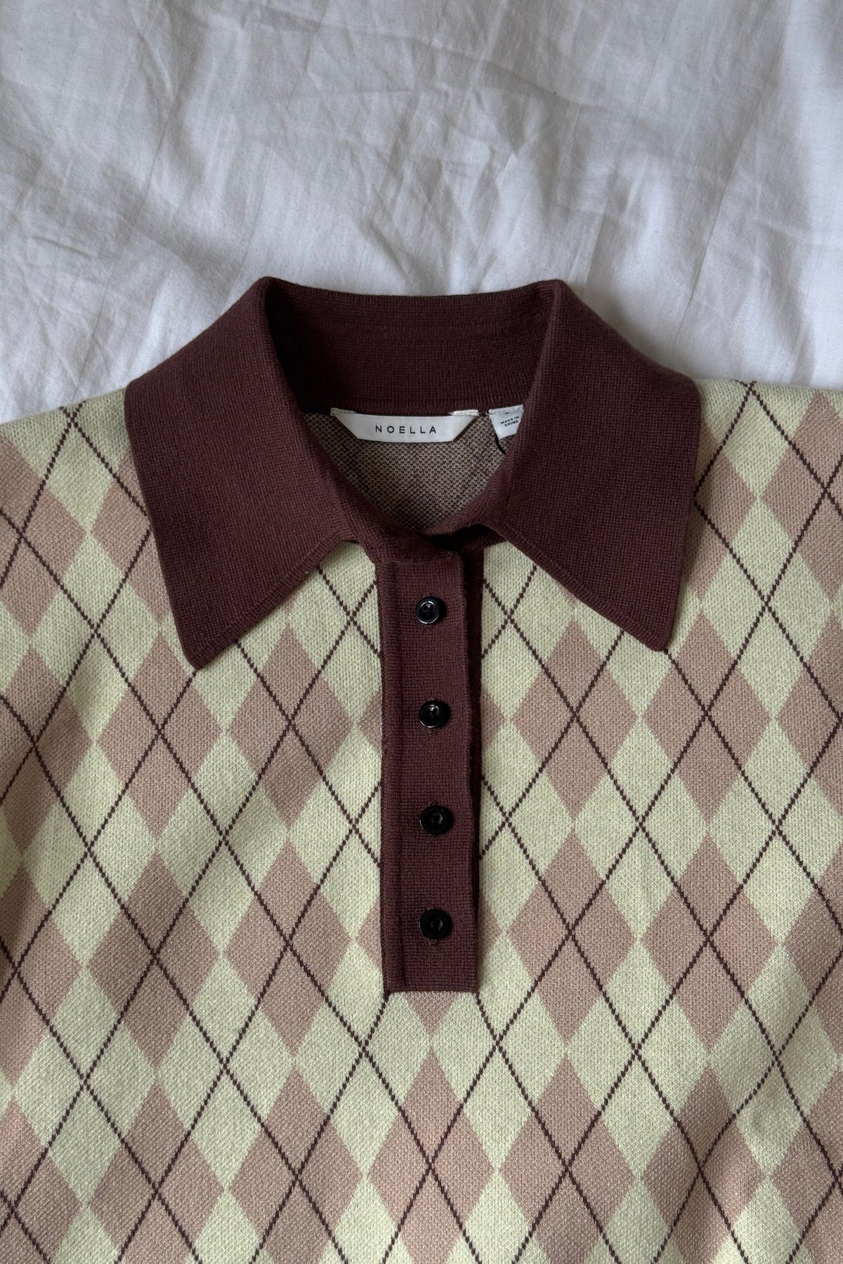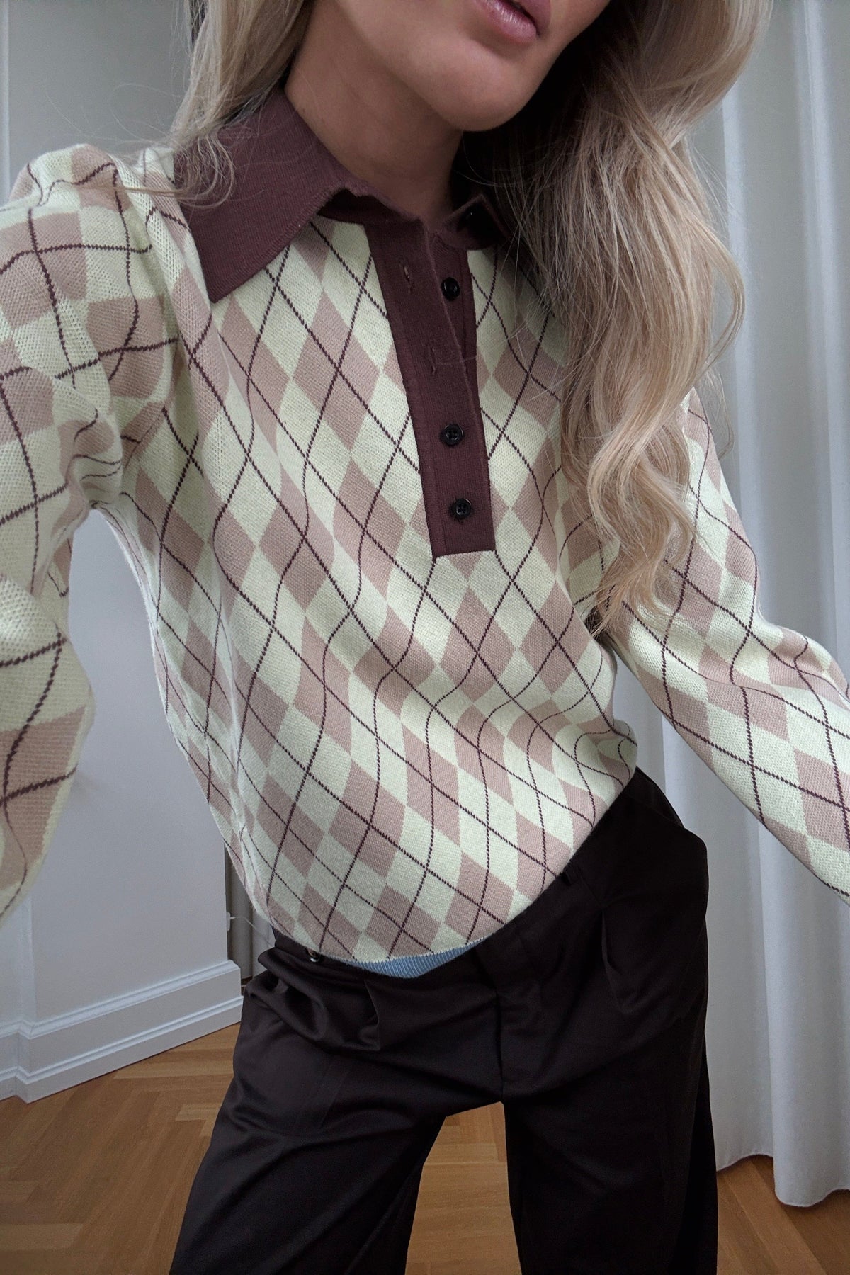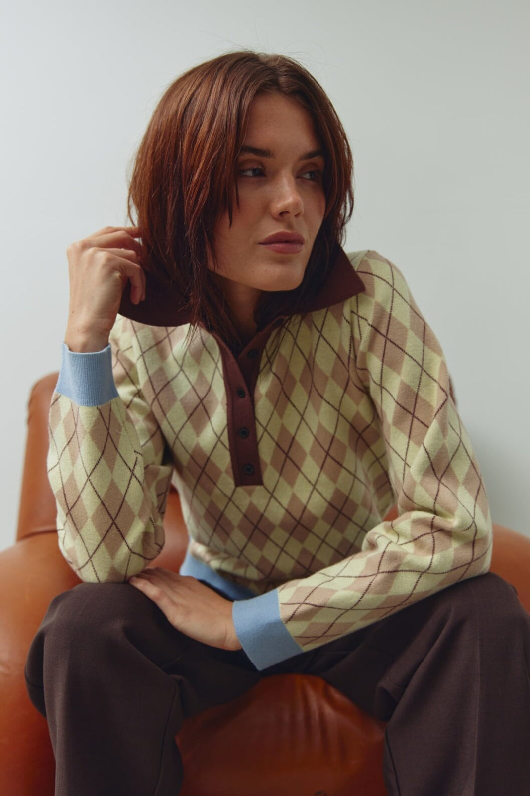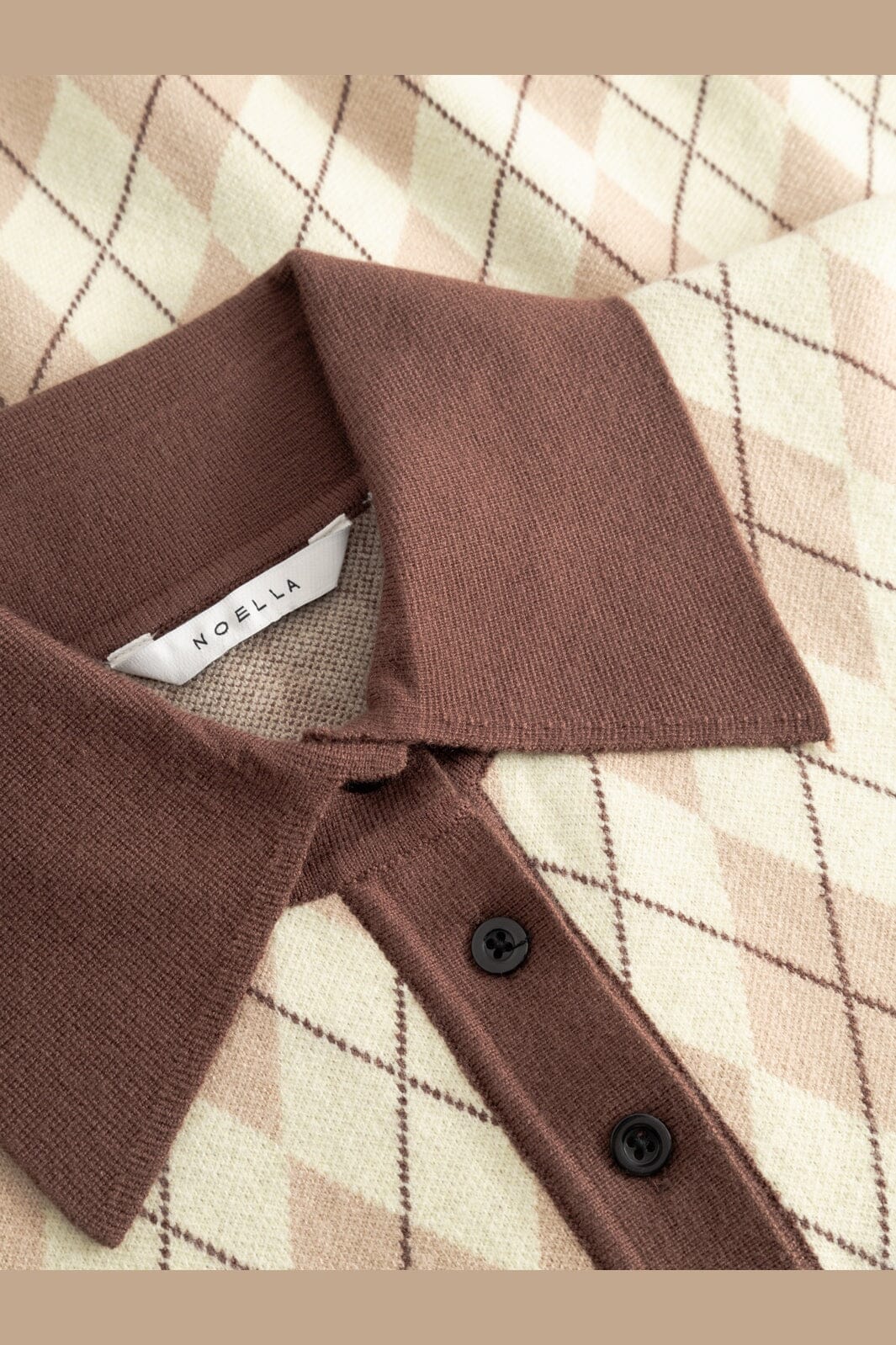 Pull en maille de Noella en jacquard intarsia à carreaux jaunes et bruns. Le pull possède un col polo marron, des manches longues avec poignets bleu clair et une coupe slim fit.