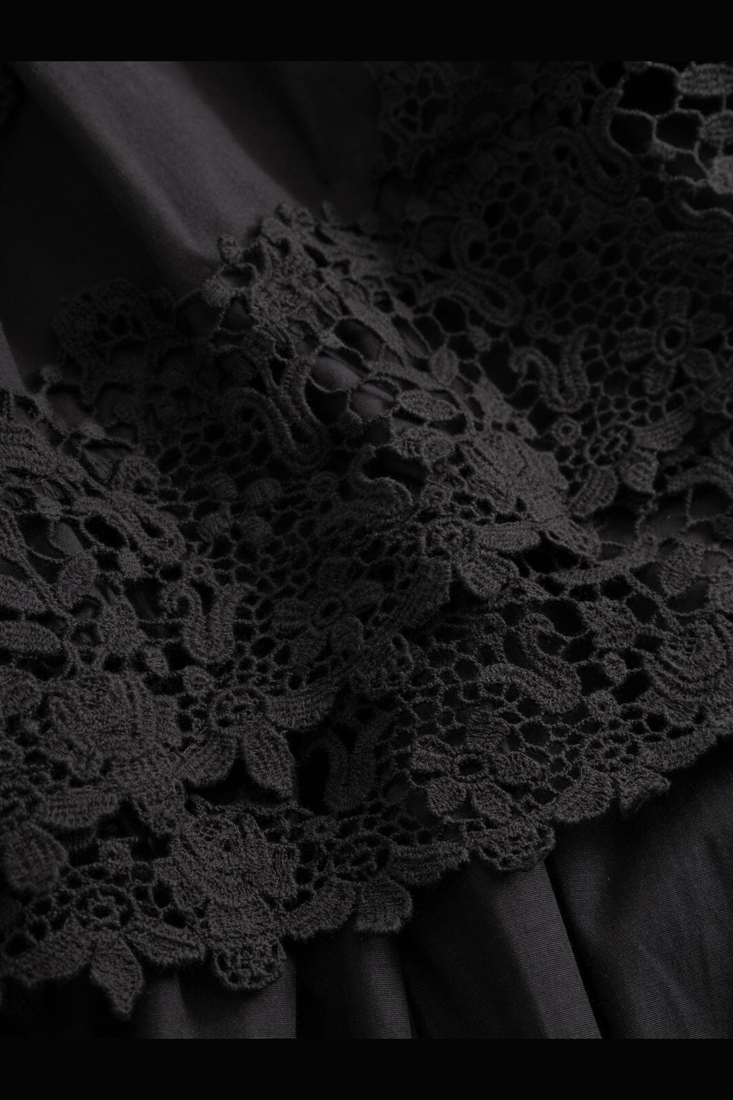 Robe noire de Noella avec broderies, dentelle et volants. La robe possède un col montant, des manches 3/4 et une jupe longueur cheville.