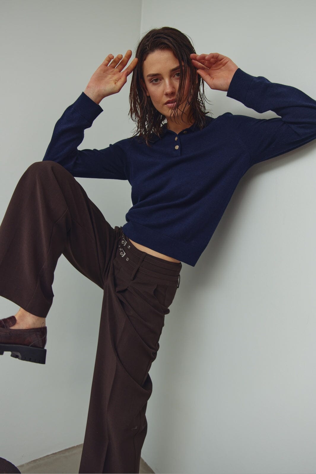 Pull en maille Noella bleu marine. Le pull présente un design polo classique avec une patte de boutonnage sur le devant et une structure tricotée à la coupe décontractée.