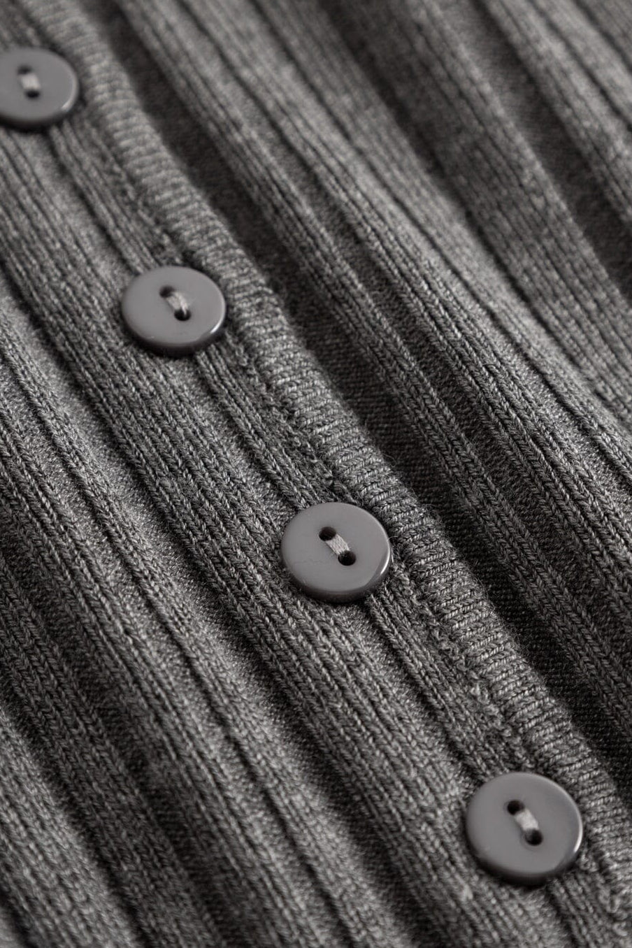 Haut gris chiné de Noella, confectionné en viscose côtelée. Le haut présente un profond décolleté en V avec une patte de boutonnage sur le devant et des manches longues.