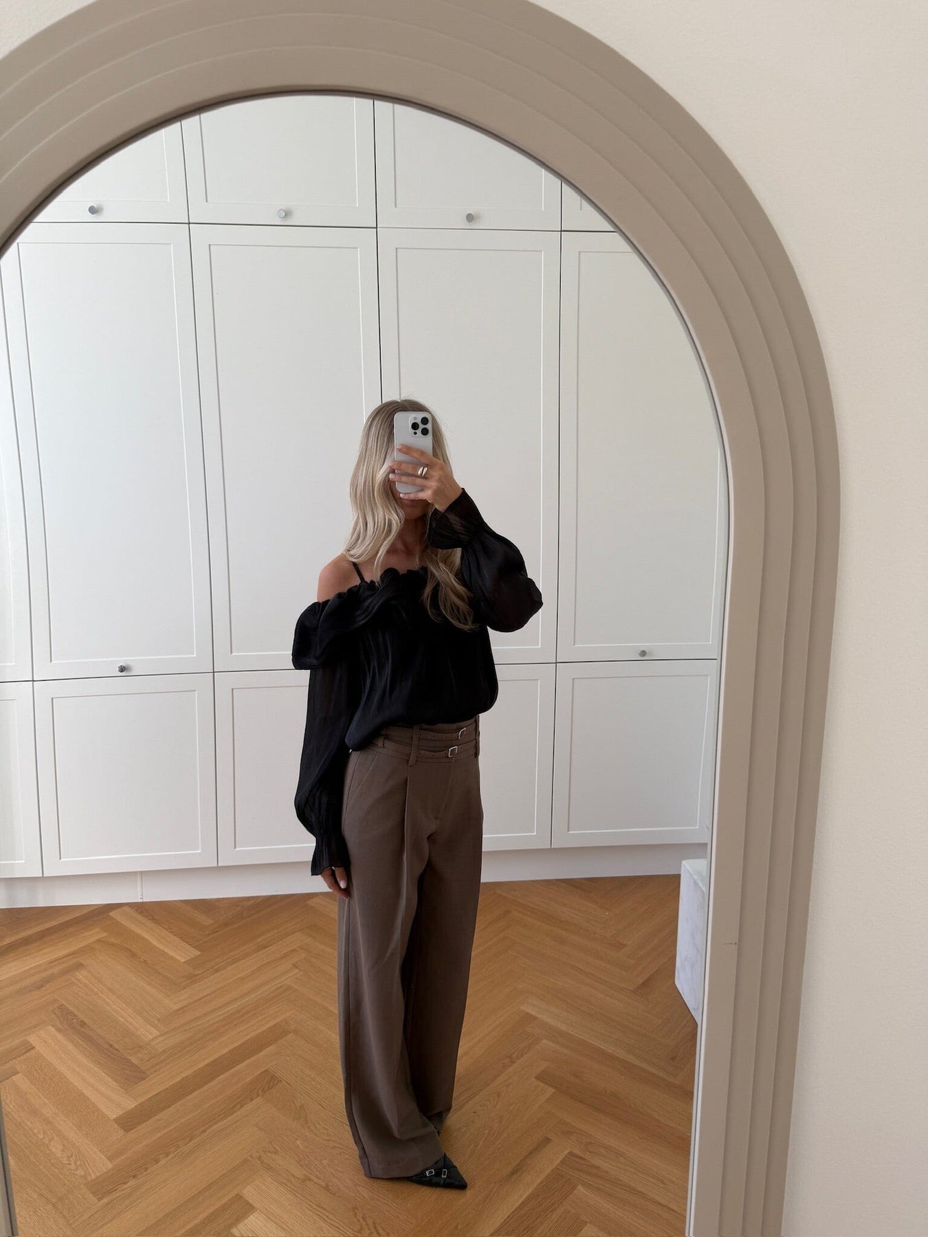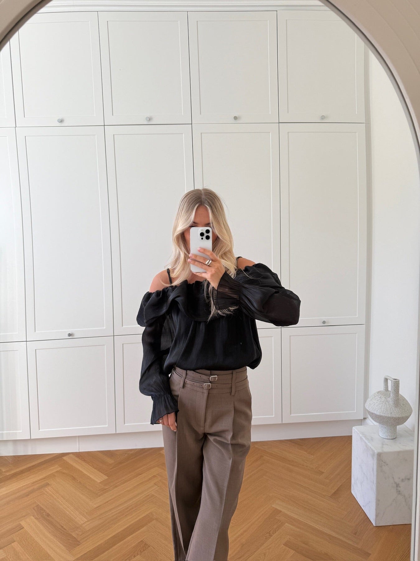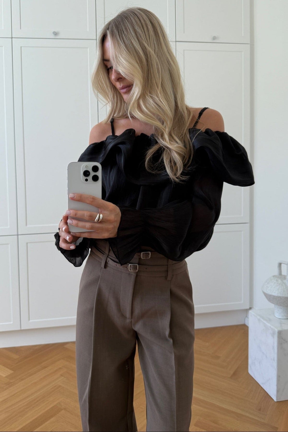 Blouse noire de Noella avec design épaules dénudées et fines bretelles. La blouse possède des manches longues avec poignets élastiques et un grand volant au niveau de la poitrine.