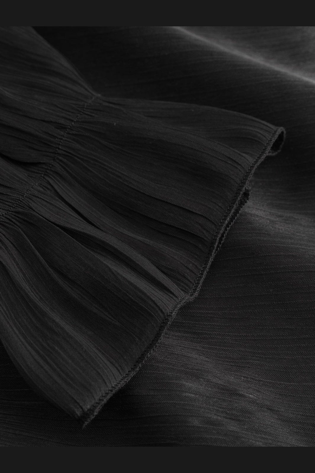 Blouse noire de Noella avec design épaules dénudées et fines bretelles. La blouse possède des manches longues avec poignets élastiques et un grand volant au niveau de la poitrine.