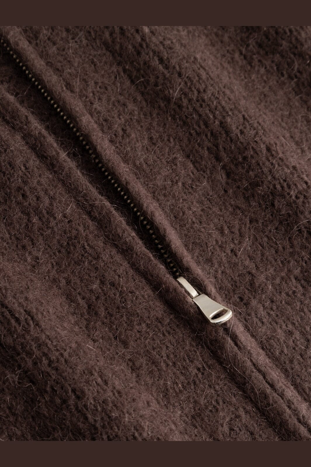 Cardigan en maille de Noella de couleur brun chocolat. Il possède une capuche, une fermeture éclair sur le devant et un lien à nouer.
