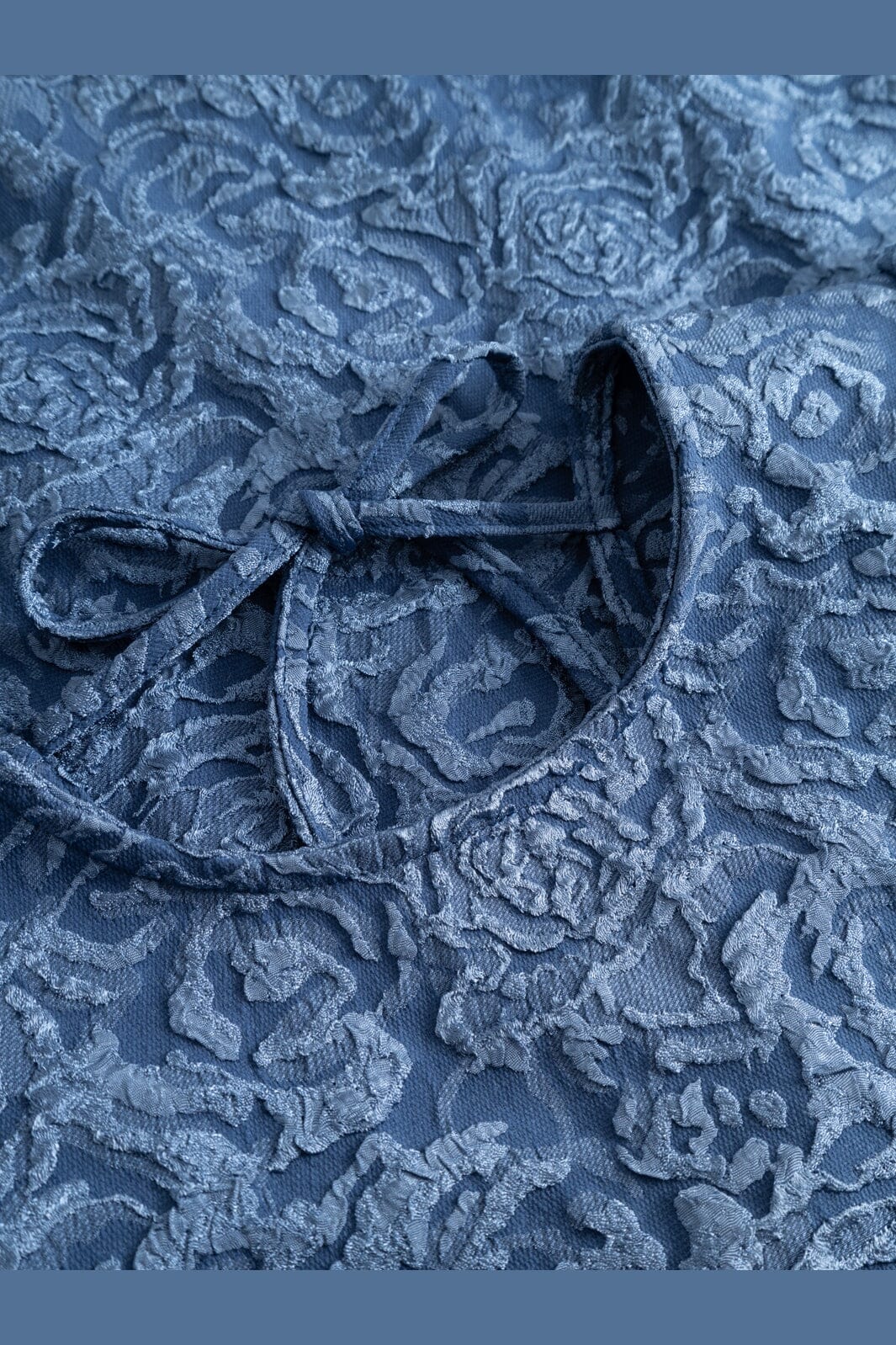 Robe longue Noella bleu poussière à motif fleuri. La robe est confectionnée en jacquard avec une texture qui donne de la profondeur au tissu.