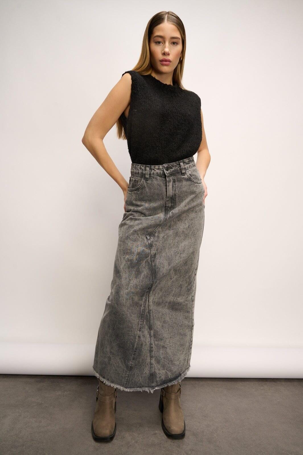 Jupe en denim longue en denim grisé avec bord frangé en bas. La jupe a une taille régulière et une longueur cheville avec un design à 5 poches et une fermeture éclair.