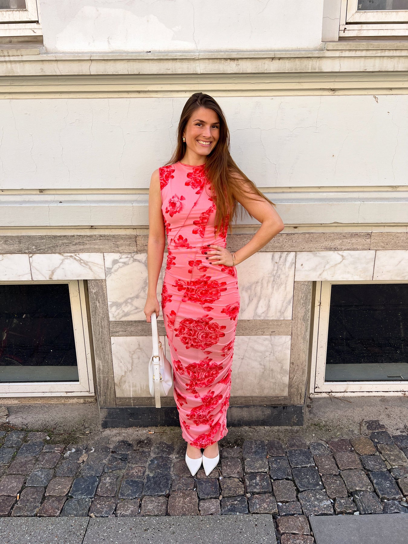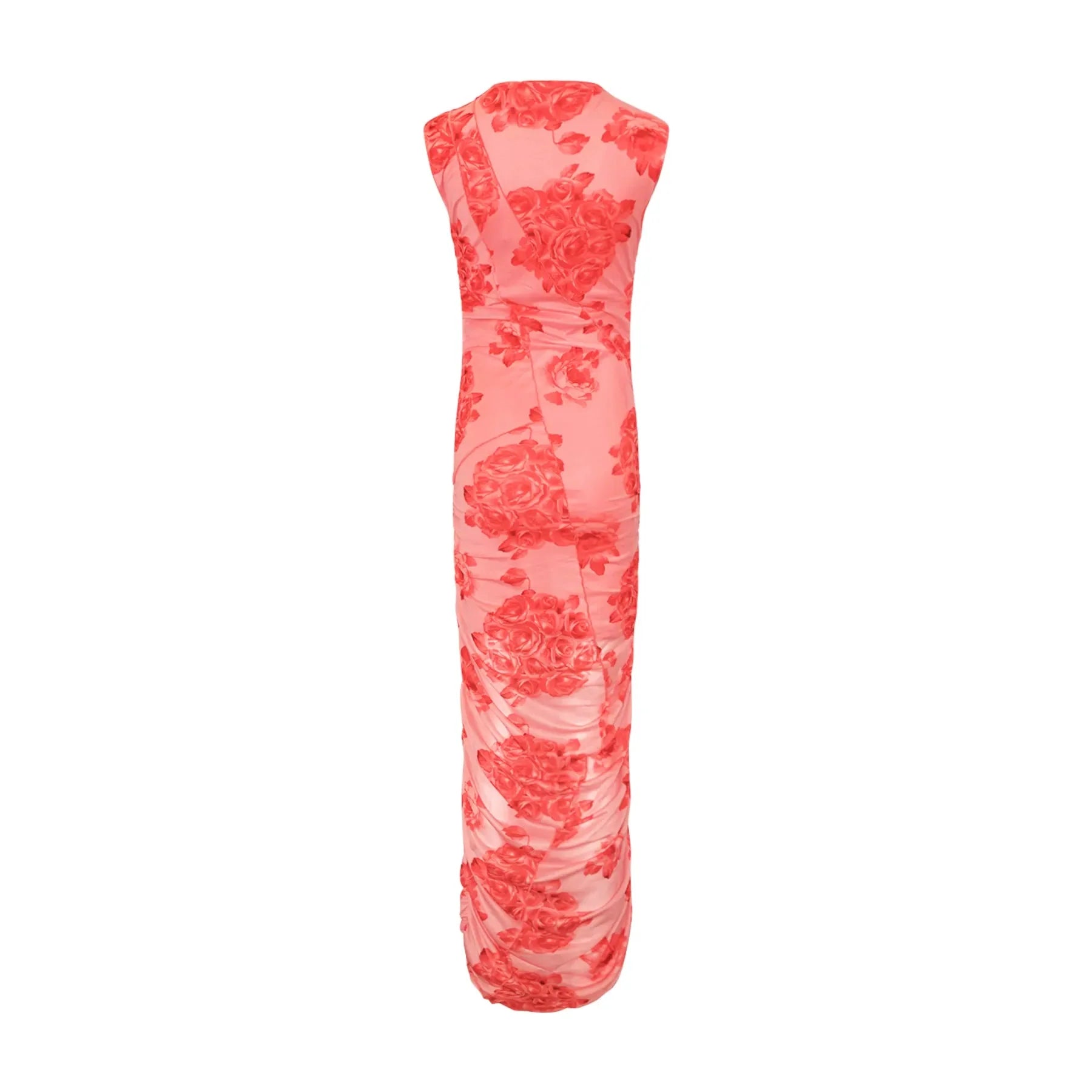 Robe ajustée de Noella en rose avec des roses rouges. La robe a des effets froncés et un design haut sans manches. La longueur longue atteint les genoux.