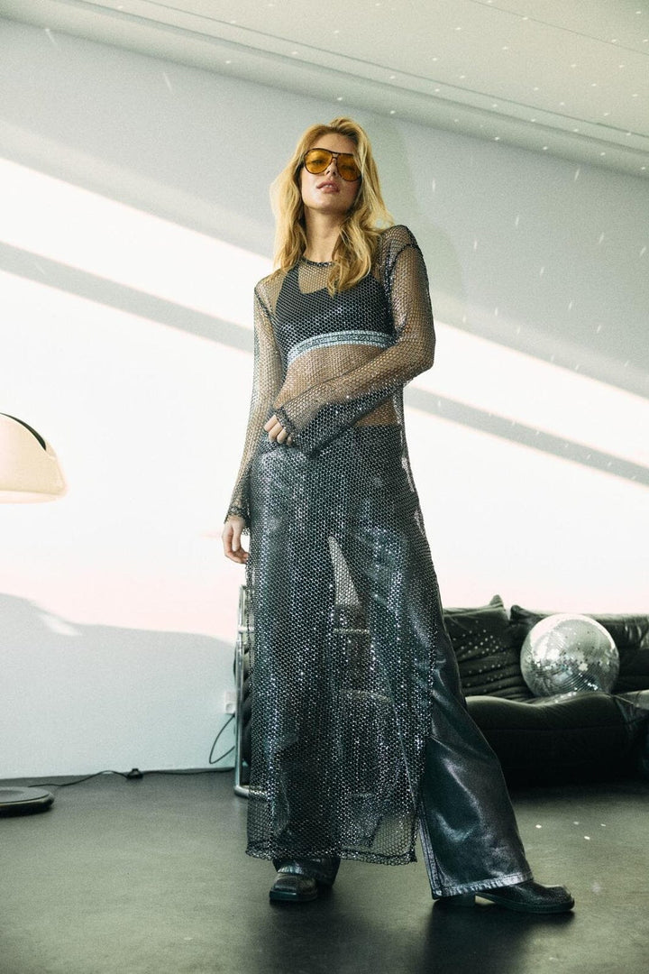 Jeans de Noisy May en denim bleu moyen avec revêtement argenté. La surface brillante combine l'effet acid wash avec un éclat métallique qui donne aux pantalons leur caractère particulier.