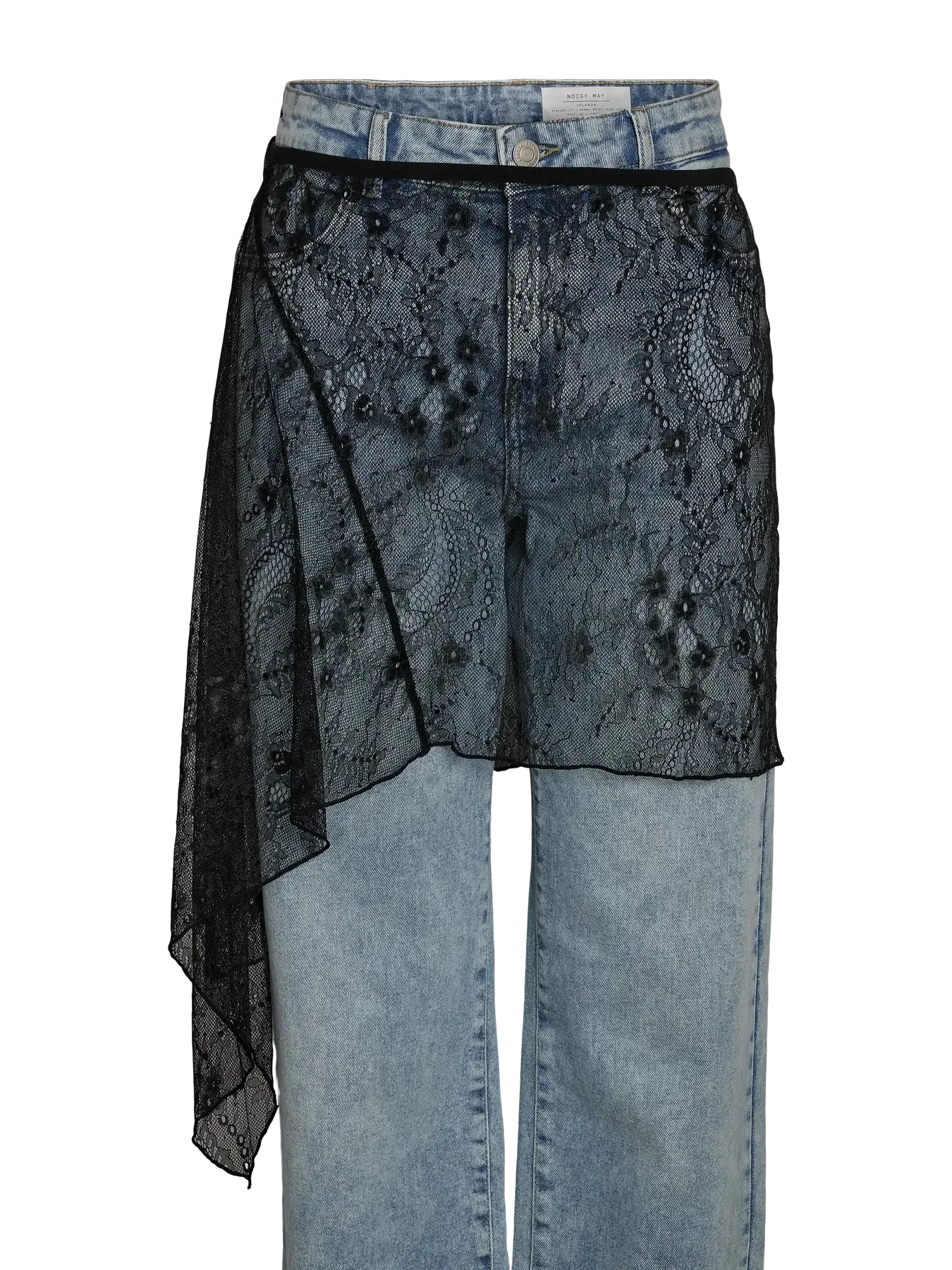 Jupe en dentelle noire de Noisy May, conçue pour être portée par-dessus un jean ou un pantalon. La jupe présente un motif floral en dentelle et un ourlet asymétrique.