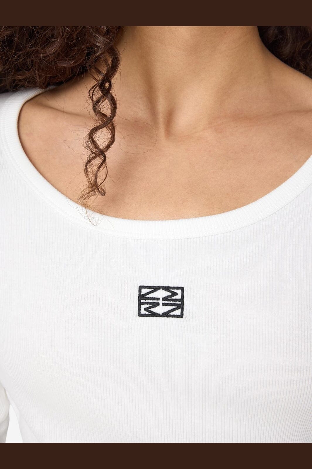 Top à manches longues blanche de Noisy May avec broderie sur le devant. Le top a un col rond et une coupe ajustée qui suit la forme du corps.