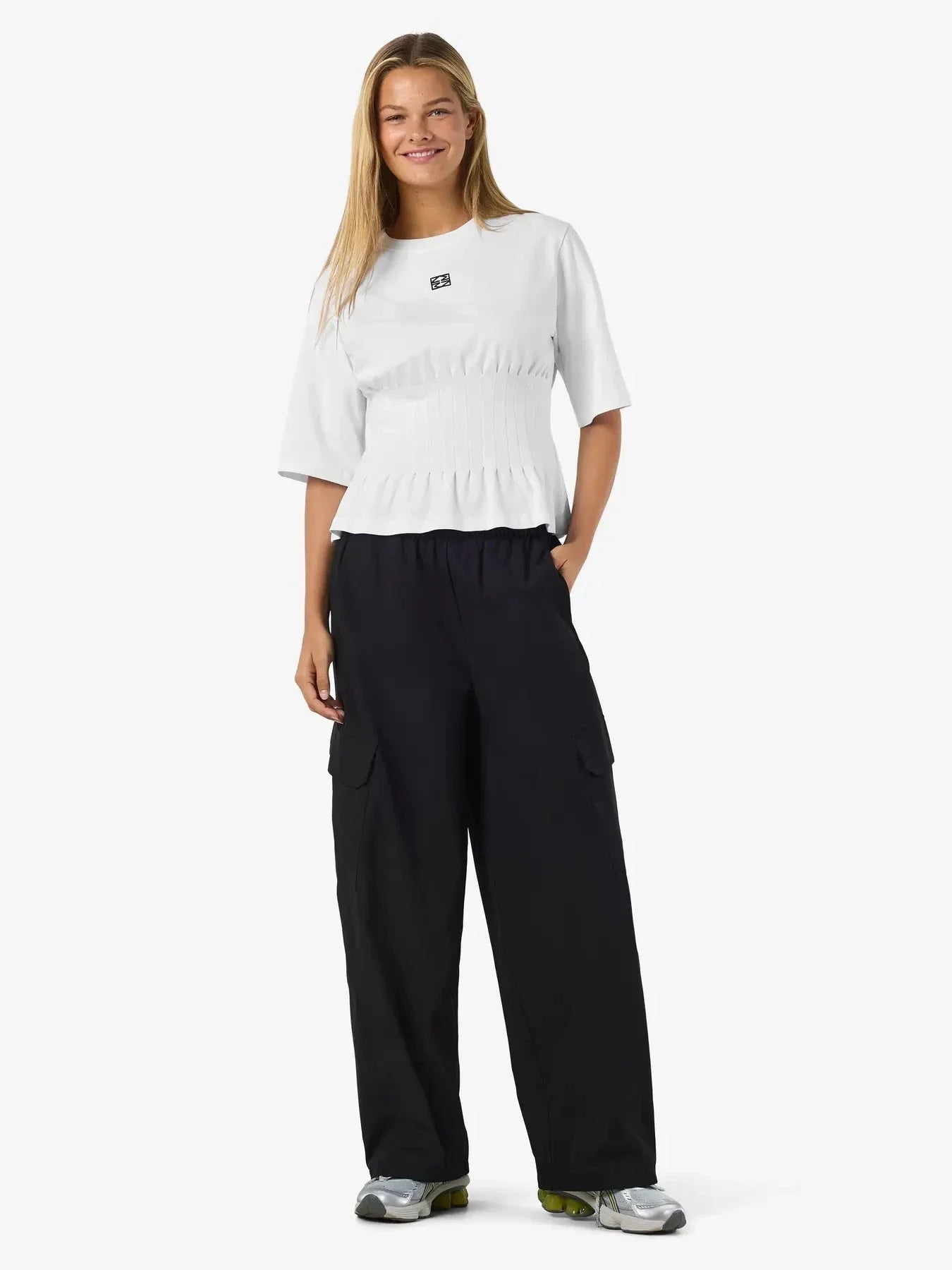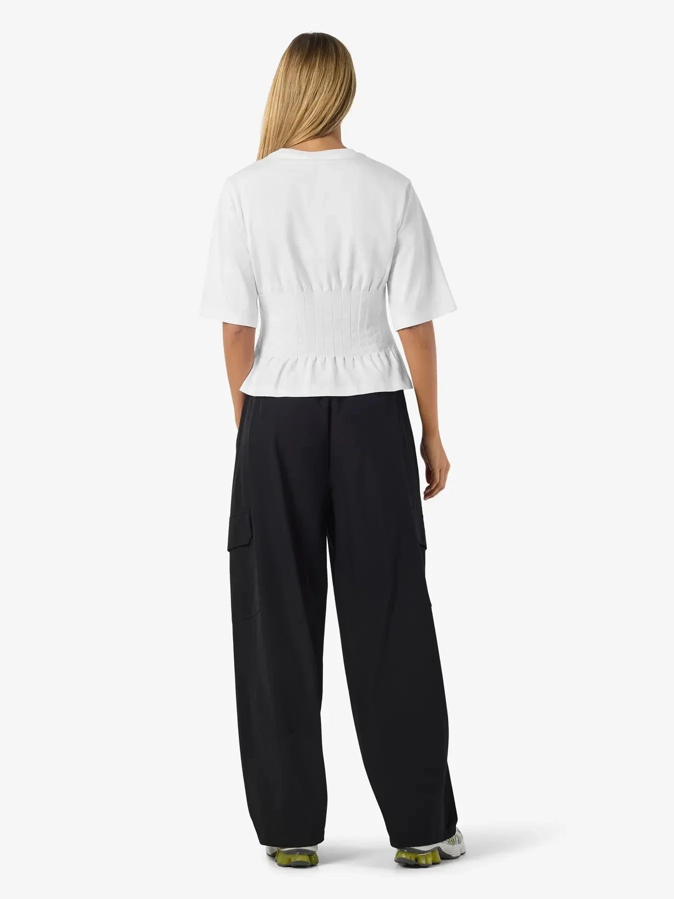 T-shirt ajusté blanc de Noisy May avec logo sur la poitrine. Le T-shirt a une couture à la taille avec des volants.
