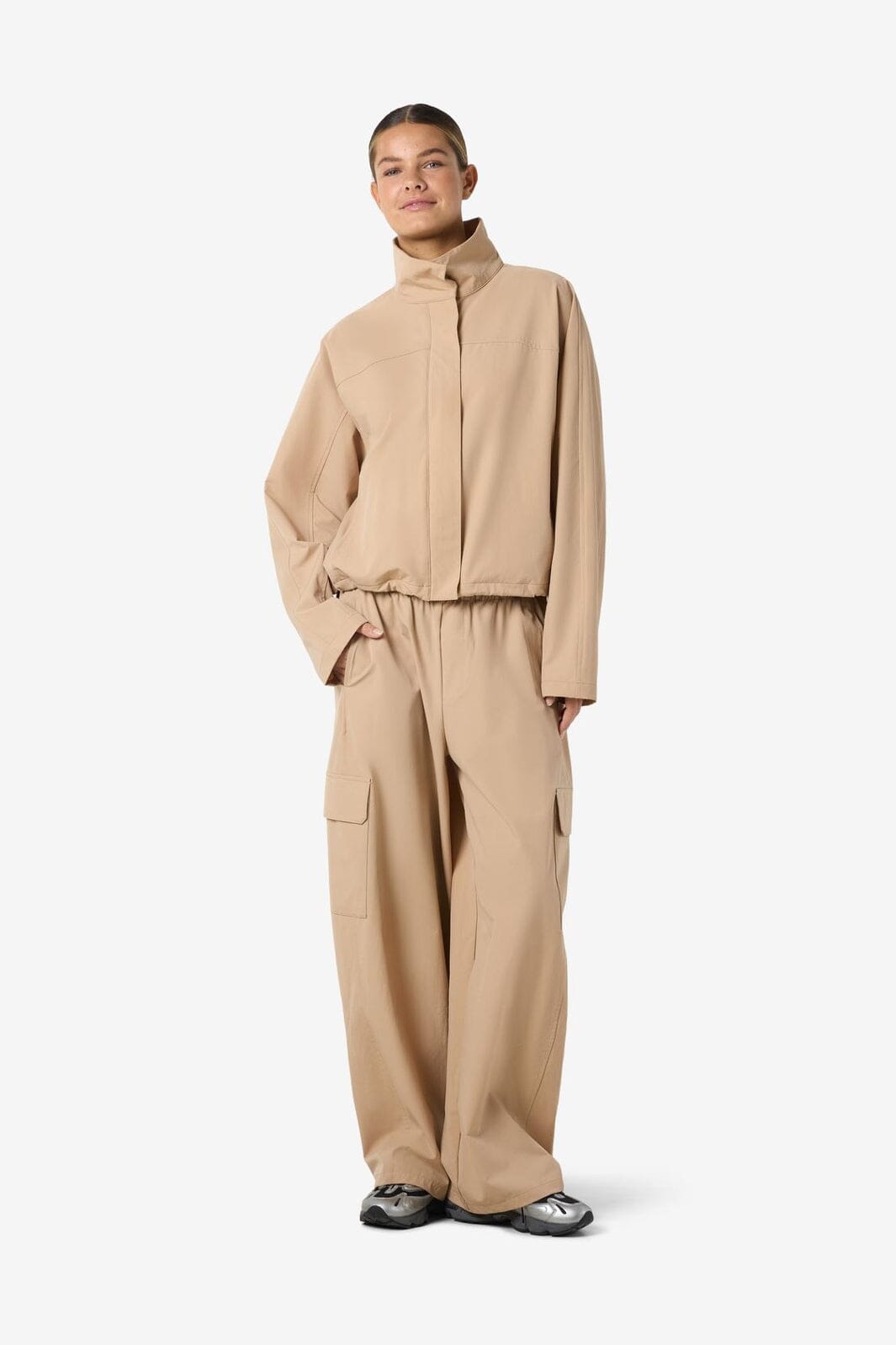 Veste beige de Noisy May avec col montant, manches longues et coupe ample. La veste possède des coutures décoratives et une bordure élastique à la taille.