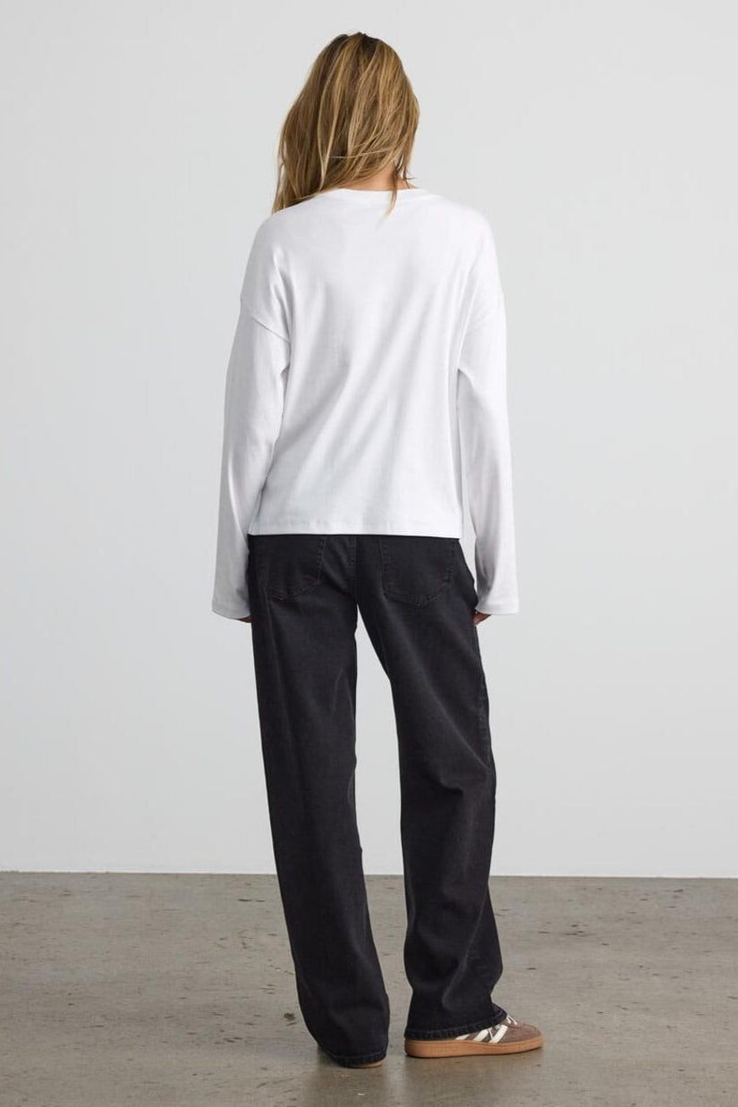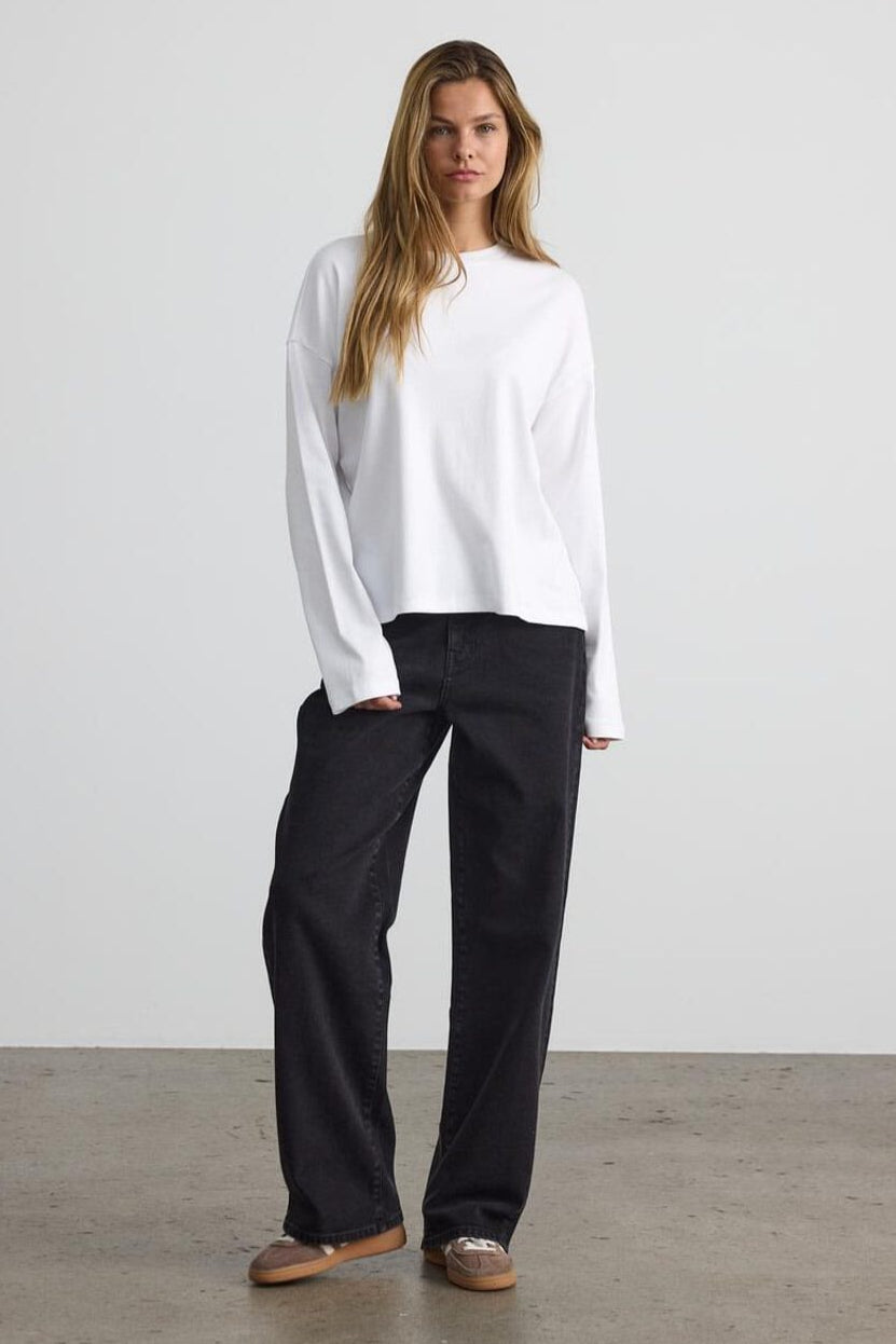 Top à manches longues blanche de Noisy May avec coupe regular. Le top a des coutures d'épaule abaissées et un col rond avec des détails brodés.