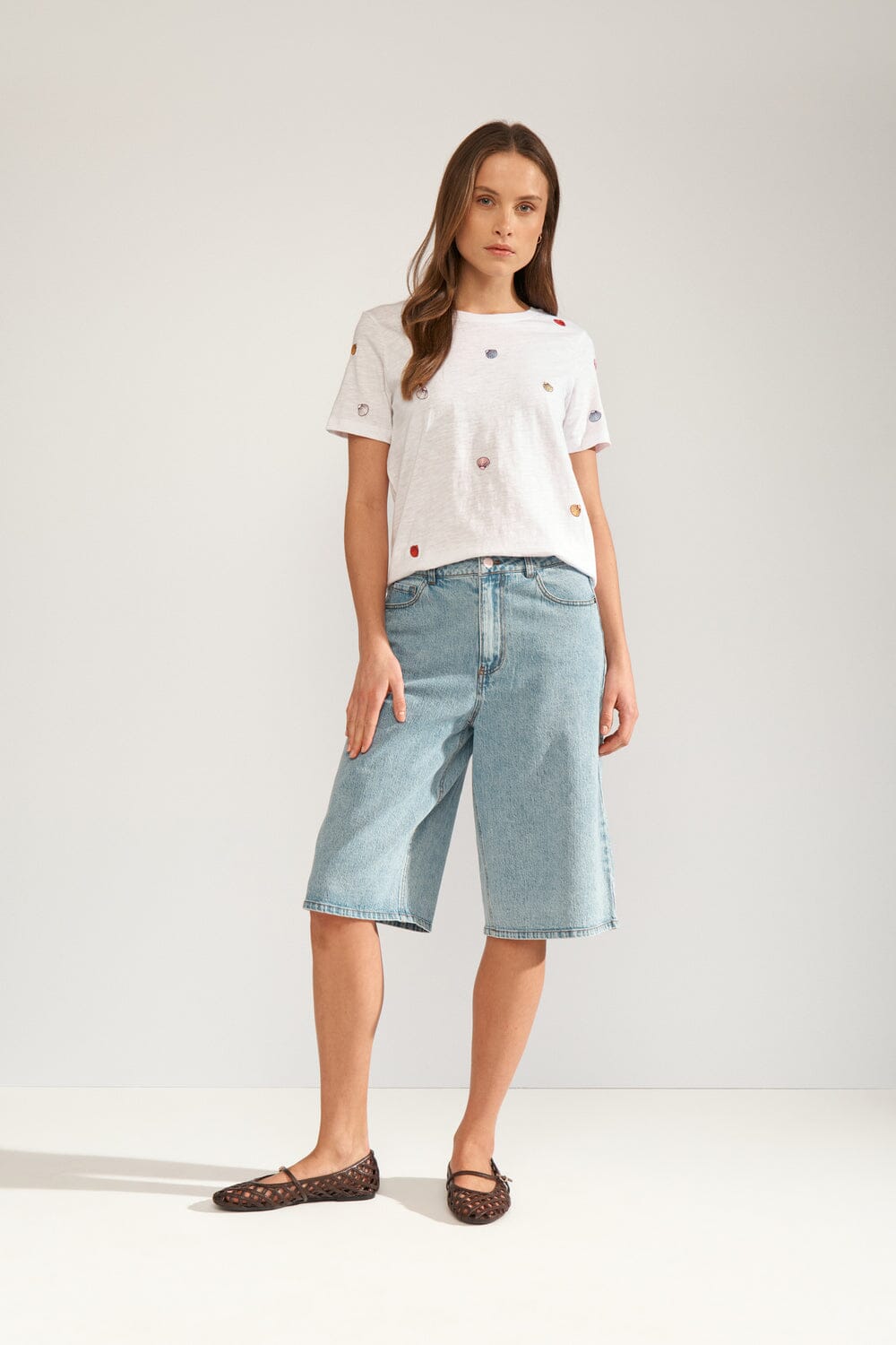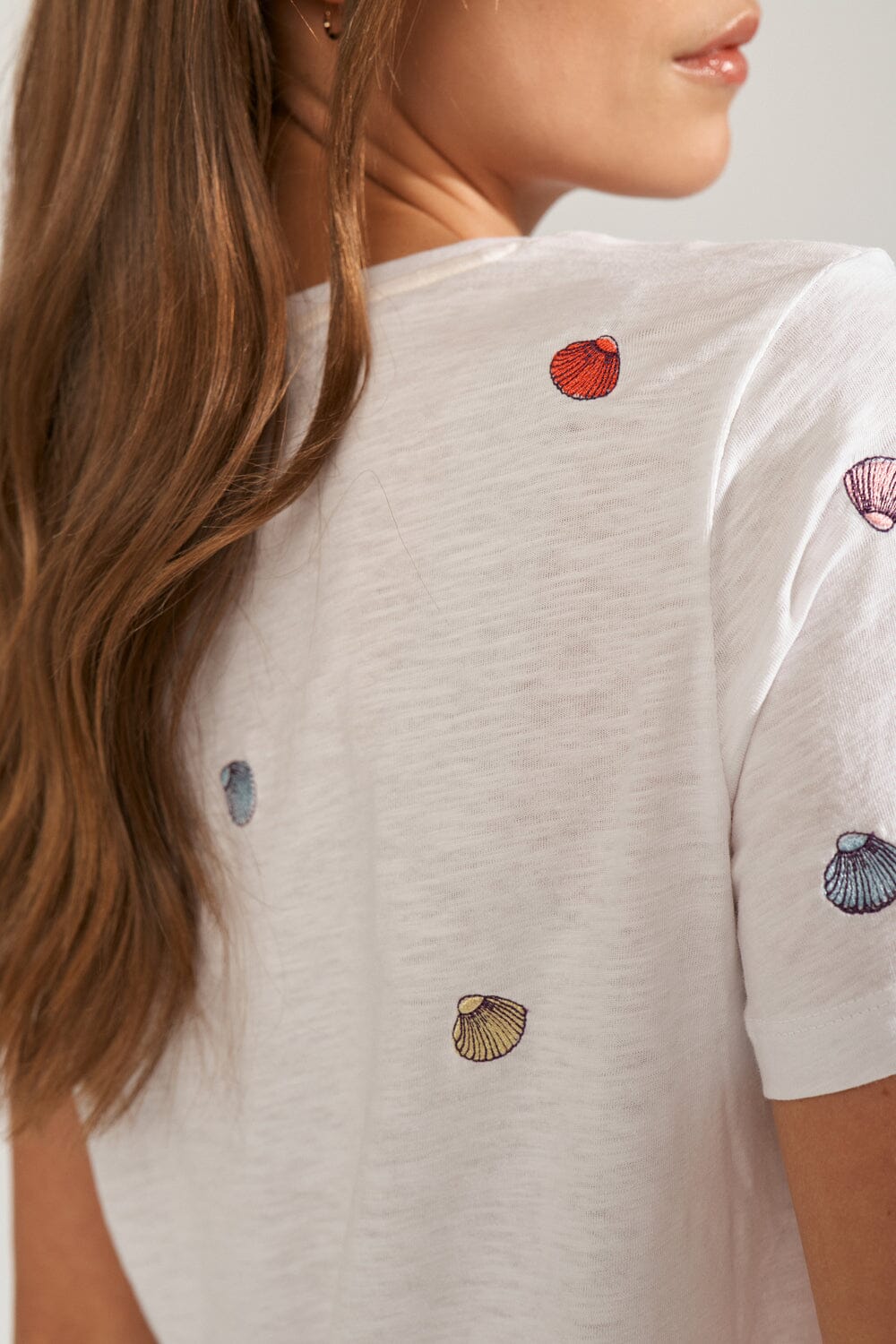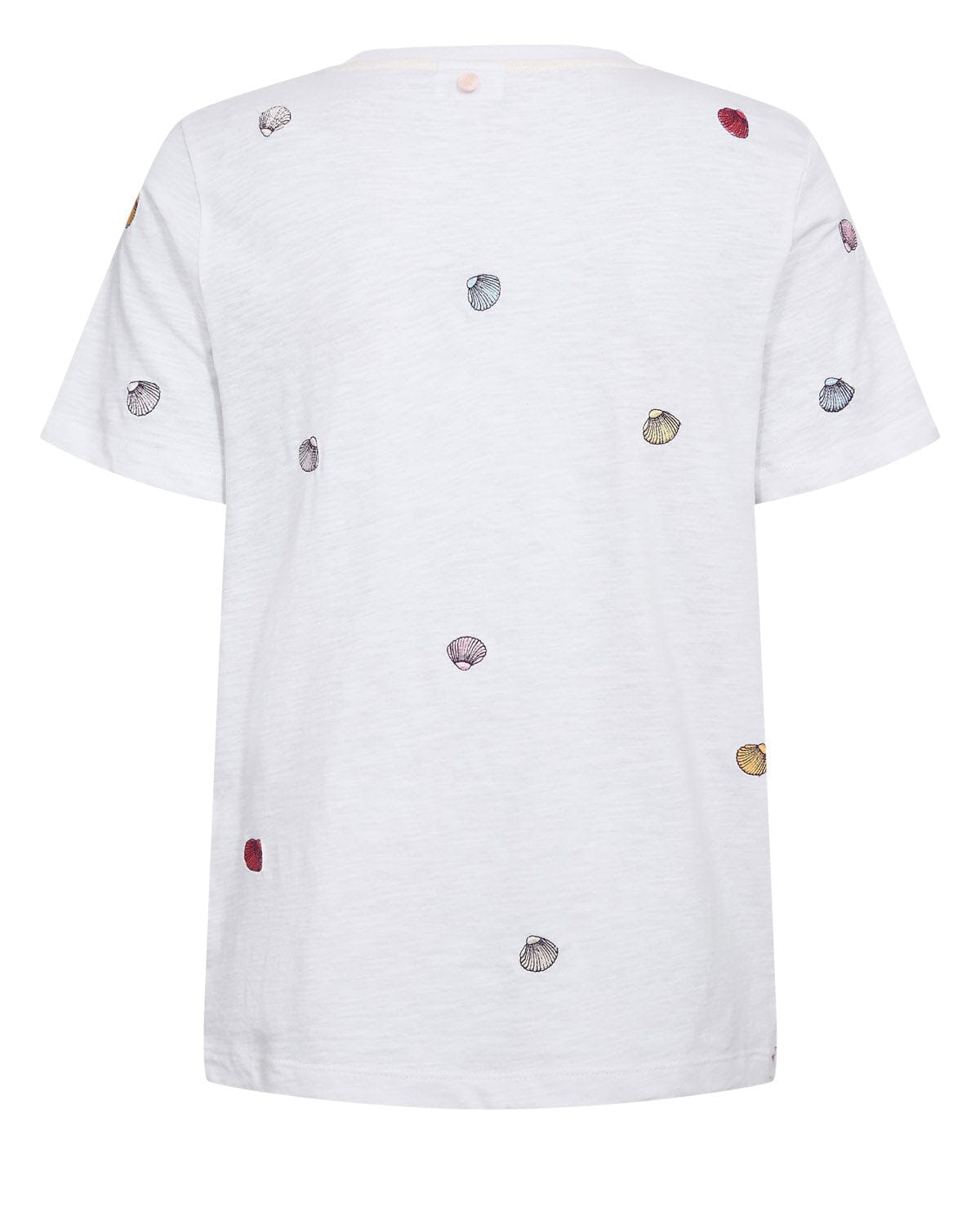 T-shirt blanc de Nümph avec des motifs de coquillages brodés dans différentes couleurs, répartis sur l’ensemble du t-shirt. Le t-shirt a des manches courtes et une encolure ronde.