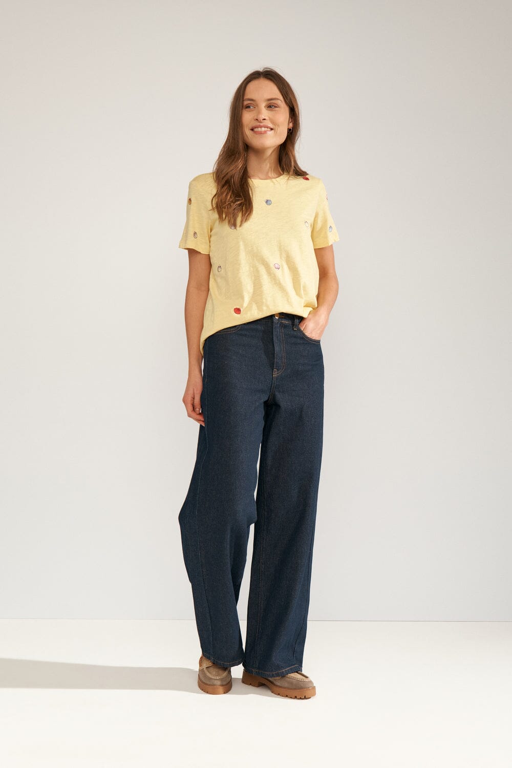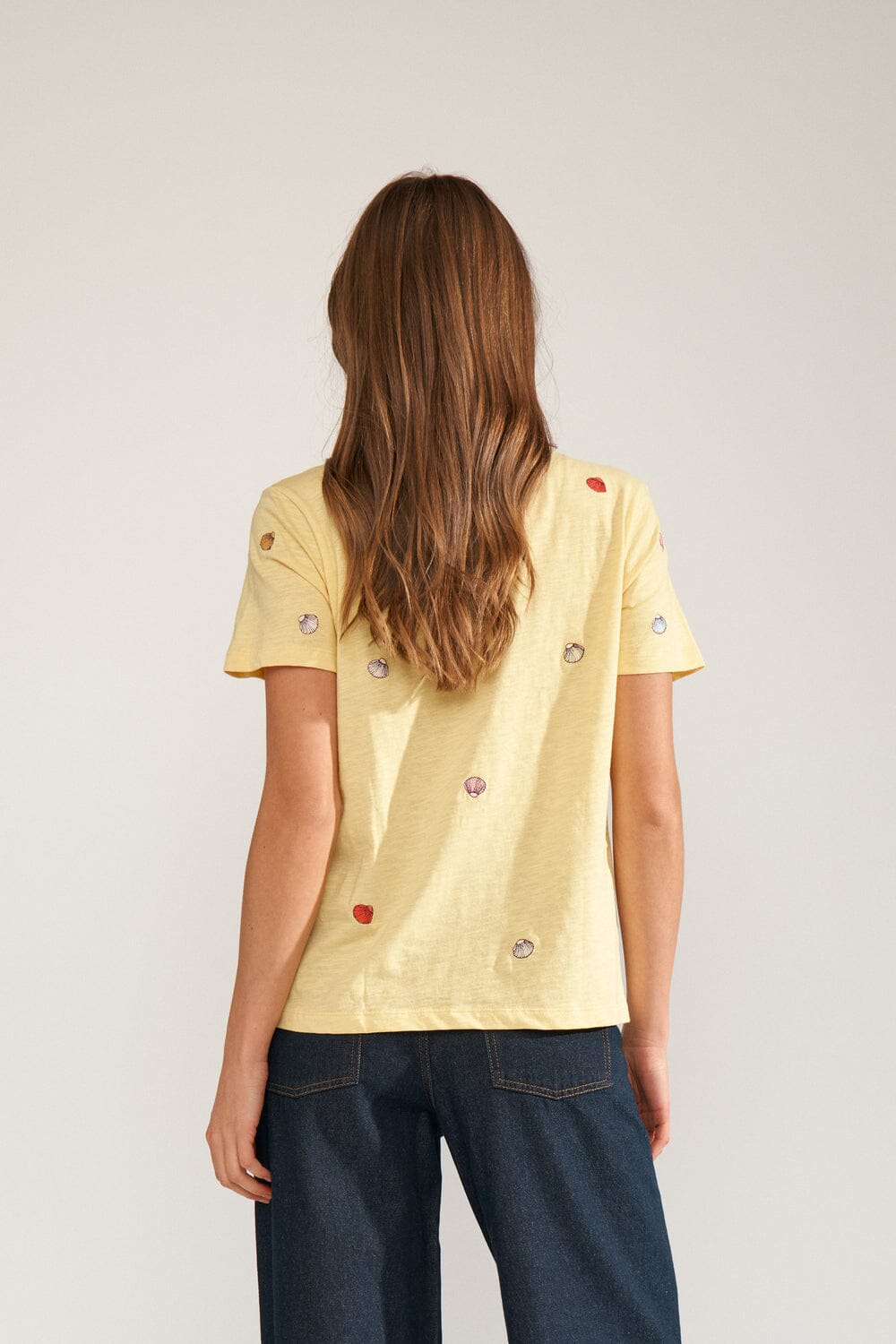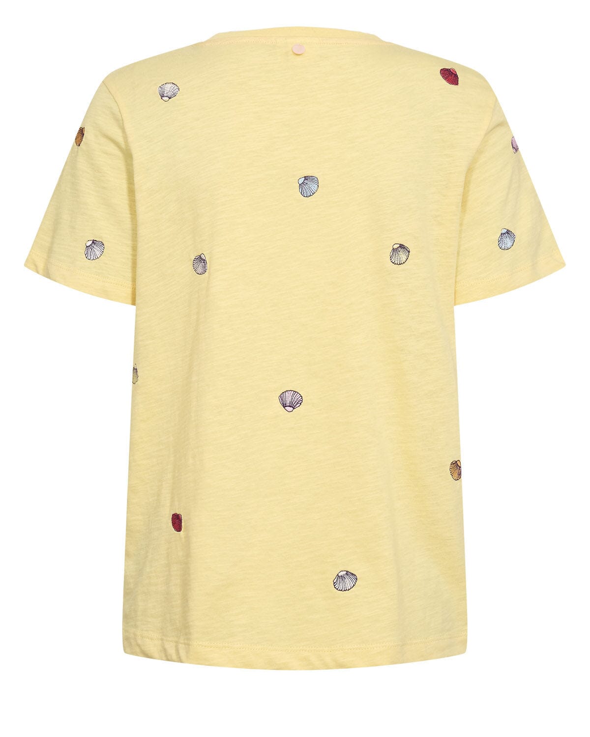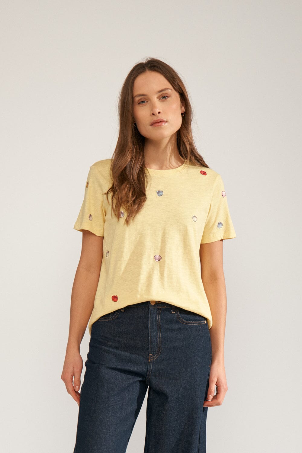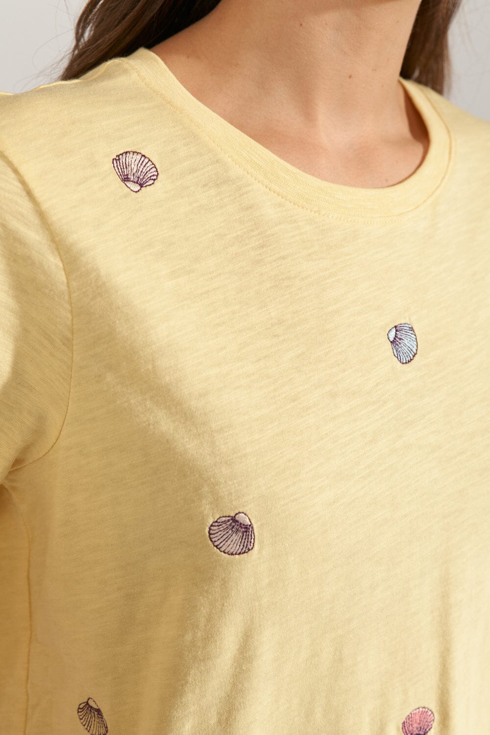 T-shirt jaune de Nümph, confectionné en 100 % coton biologique. Le T-shirt présente de petits motifs de coquillages brodés, répartis sur le tissu.
