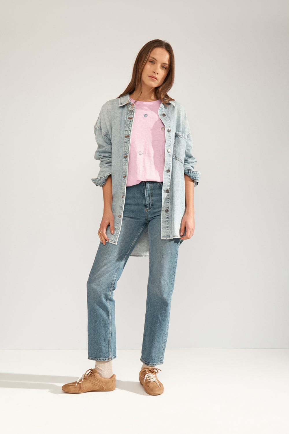 T-shirt rose de Nümph, fabriqué en coton biologique. Des motifs de coquillages sont brodés sur l’ensemble du T-shirt dans différentes couleurs.