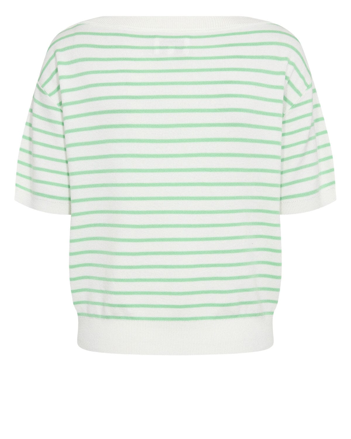 Pull rayé de Nümph en vert clair et blanc. Il possède un large col bateau et des manches courtes.