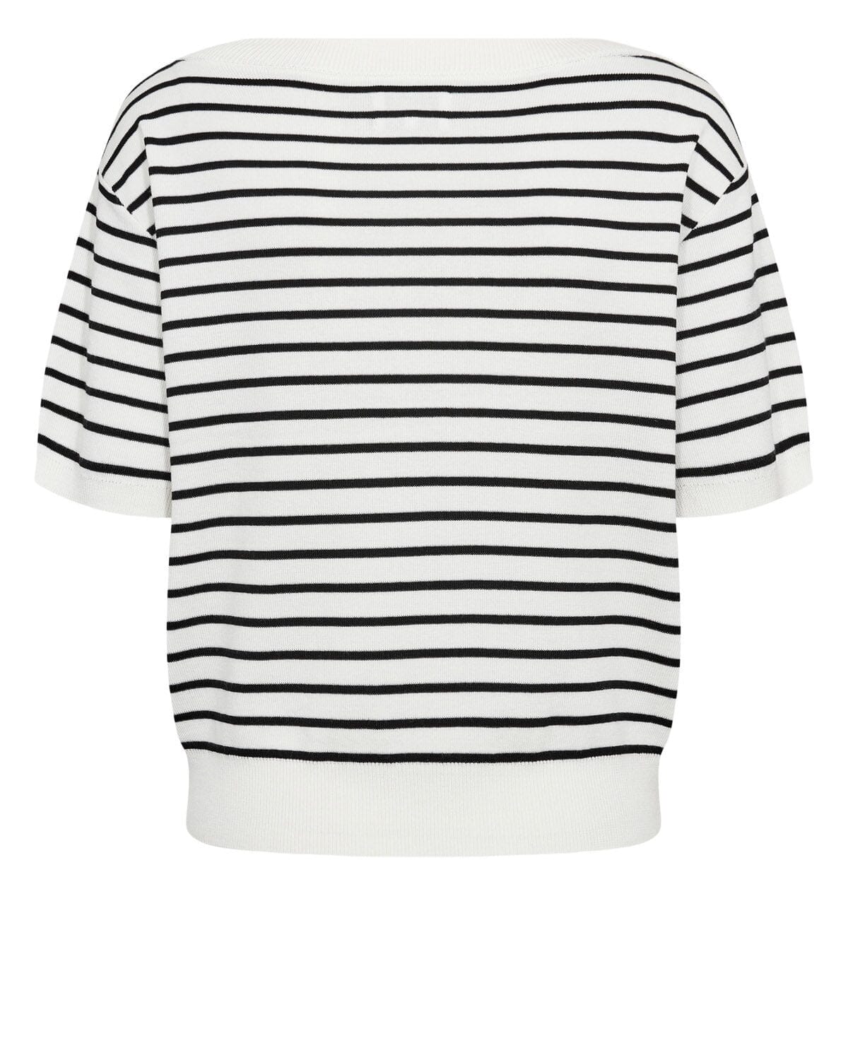 Pull rayé de Nümph avec motif horizontal noir et blanc. Il possède une encolure ronde et large ainsi que des manches courtes.