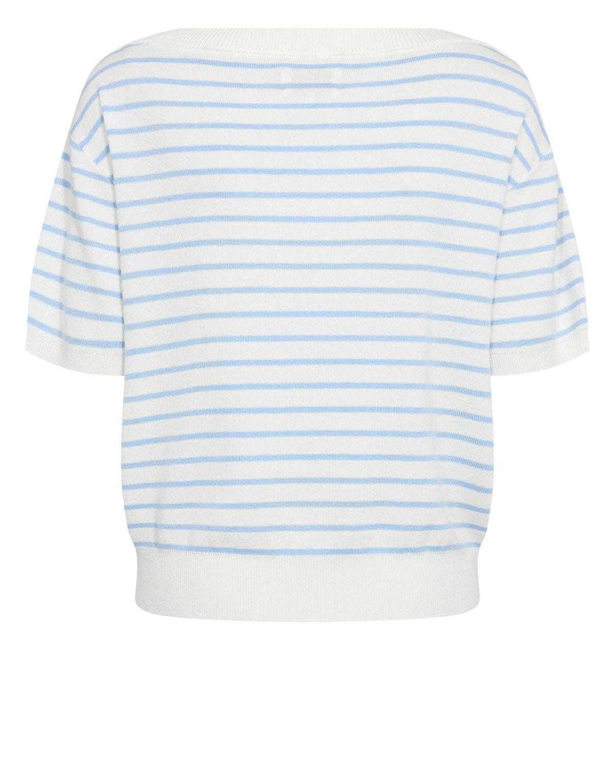 Pull à manches courtes de Nümph avec des rayures horizontales bleu clair sur fond blanc. Le pull présente des bords côtelés à l’encolure et aux manches.