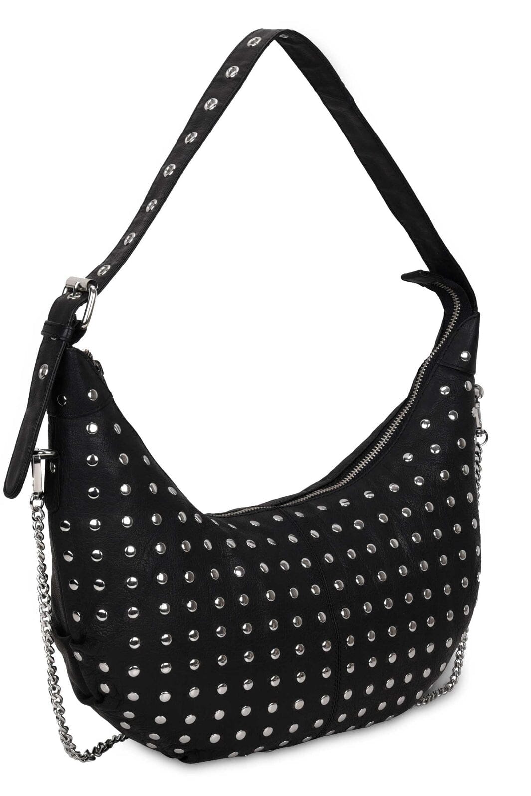 Sac en cuir noir de Núnoo avec des clous argentés. Le sac a une forme incurvée et est équipé d'une fermeture éclair ainsi que d'une poche intérieure zippée.