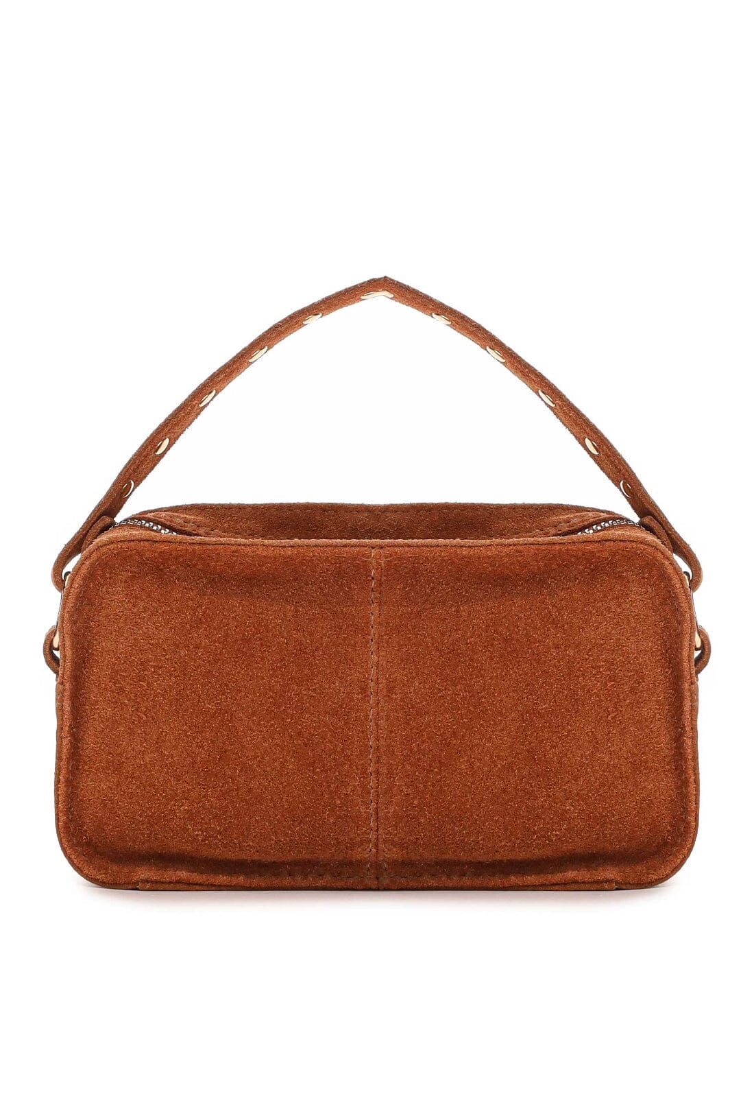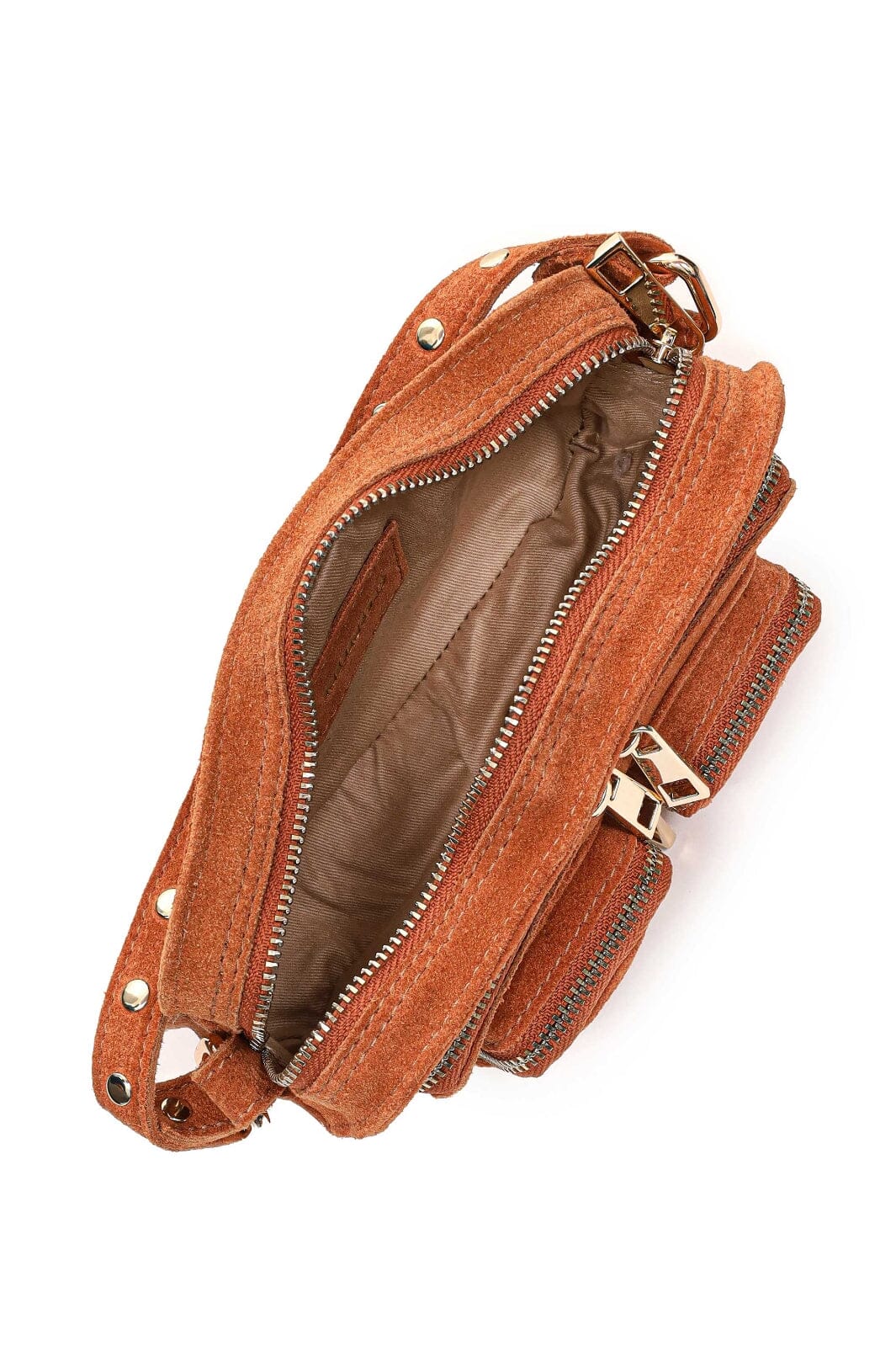 Sac en daim de Núnoo en couleur toffee brun avec des détails dorés. Le sac a plusieurs compartiments avec des fermetures éclair et une bandoulière en chaîne avec des détails en cuir, qui peut être utilisée à la fois comme bandoulière et comme bandoulière croisée.