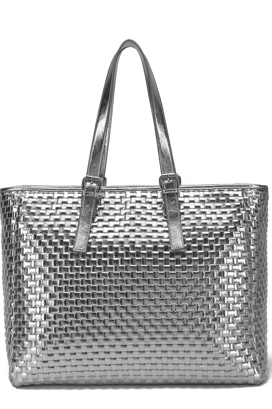 Maxi shopper argenté de Núnoo avec un design tressé. Le sac est fabriqué à partir de matériaux recyclés et a une expression artisanale avec ses détails tressés.