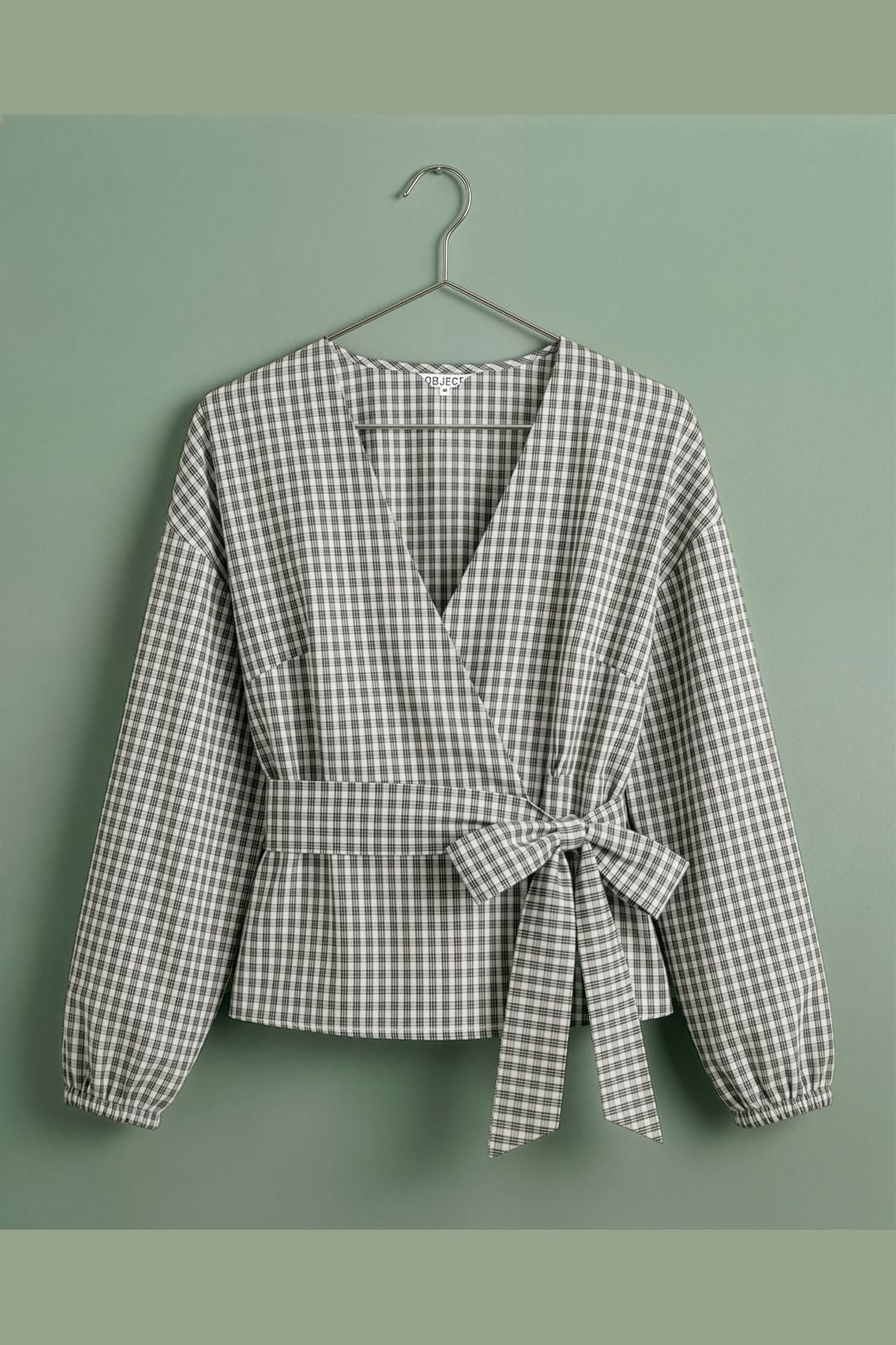 Blouse cache-cœur de la marque Object avec un motif à carreaux noir, crème et blanc. Confectionnée en 100 % coton avec des manches longues et un décolleté en V.