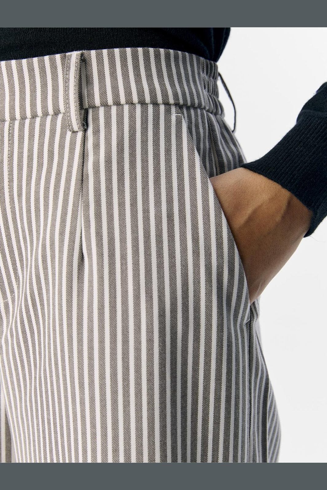 Pantalon rayé d'Object avec jambes larges et pli avant. Les rayures claires sur fond brun créent une expression classique, tandis que la coupe ample offre une bonne liberté de mouvement.