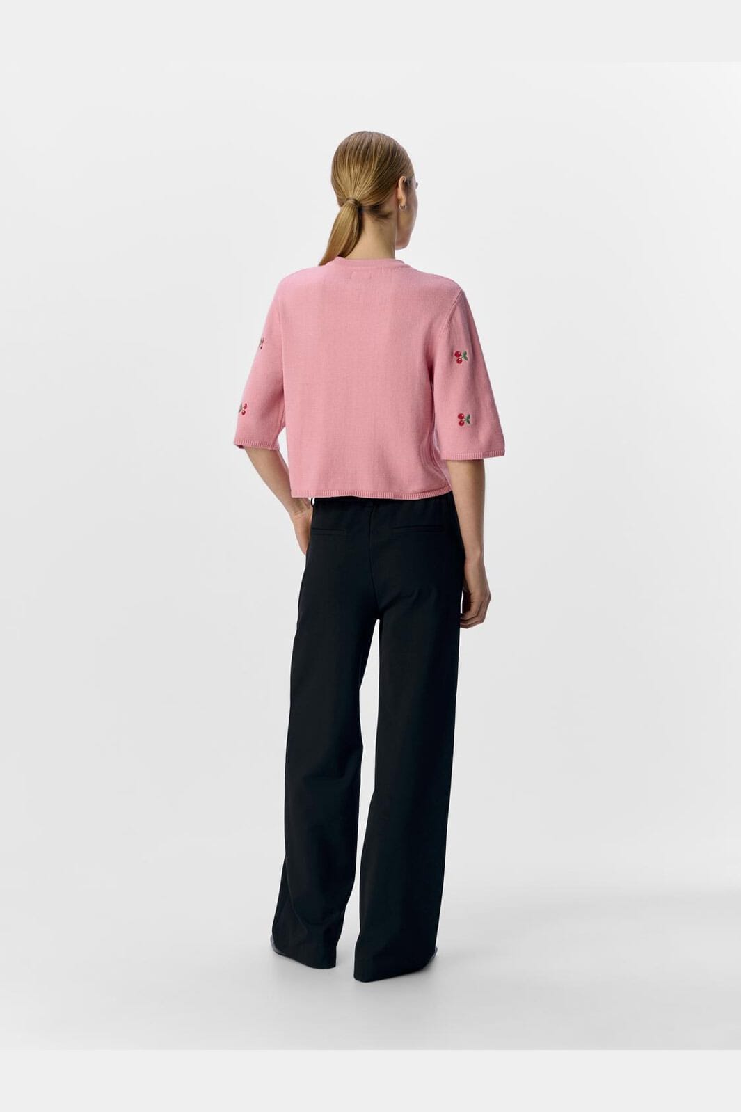 Cardigan rose de Object avec broderie de cerise sur l'ensemble du design. Il a un col rond et des manches 3/4 avec des bords côtelés aux poignets. Les boutons à l'avant le rendent facile à enfiler et à retirer.