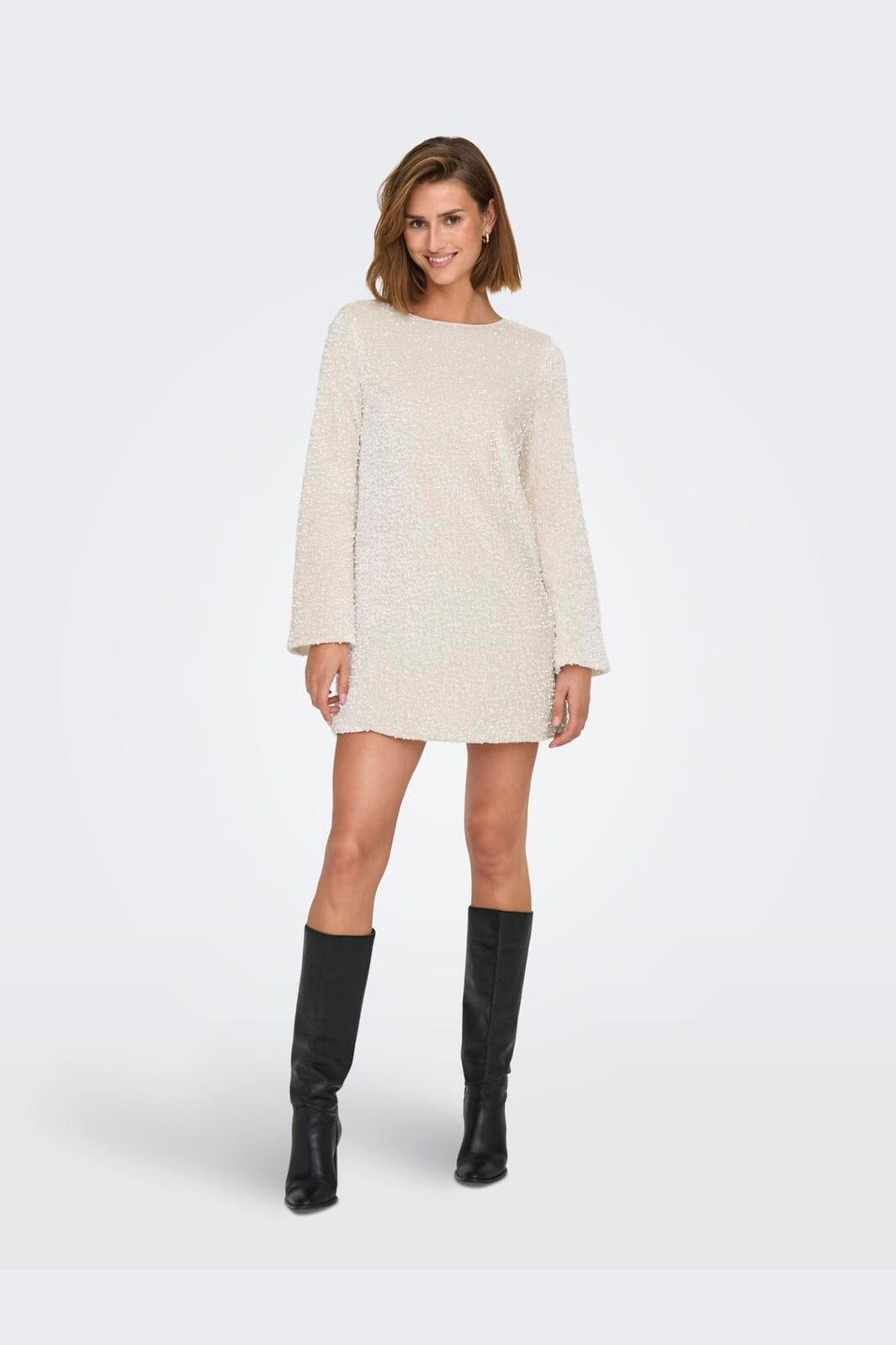 Robe à paillettes de Only dans une nuance crème claire. La robe a des manches longues couvertes de paillettes et un nœud noir à l'arrière.