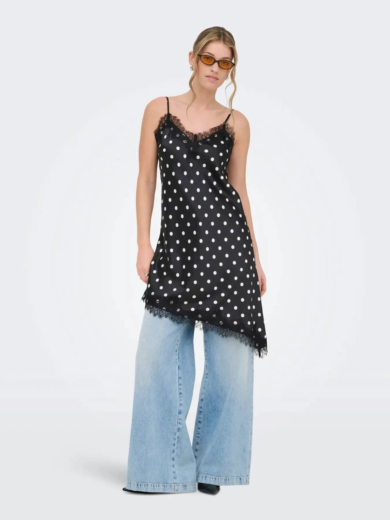 Robe en satin noire de la marque Only avec des pois blancs et des bordures en dentelle. La robe possède de fines bretelles spaghetti et un ourlet asymétrique avec bordure en dentelle.