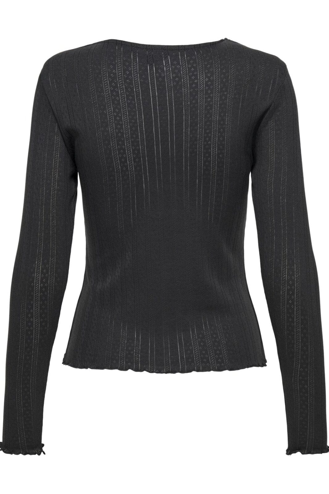 Top noir à manches longues de Only avec col rond. Le top a une couture décorative dans un motif avec des lignes verticales et de petites formes de diamant, ainsi que des bords ondulés aux manches et au bas.