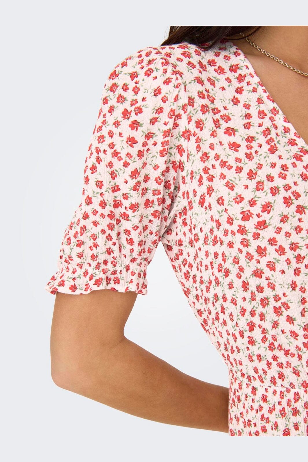Robe longue de la marque Only en 100 % viscose Lenzing™ Ecovero™. La robe présente un motif floral rouge sur fond blanc.