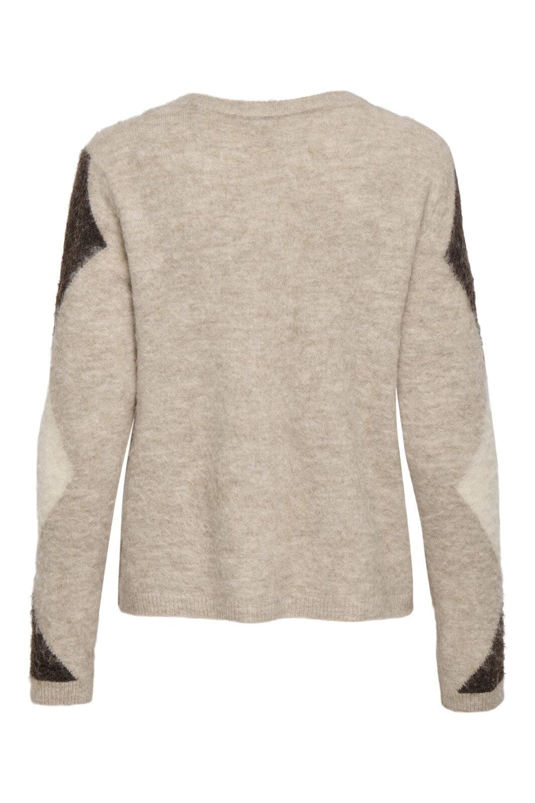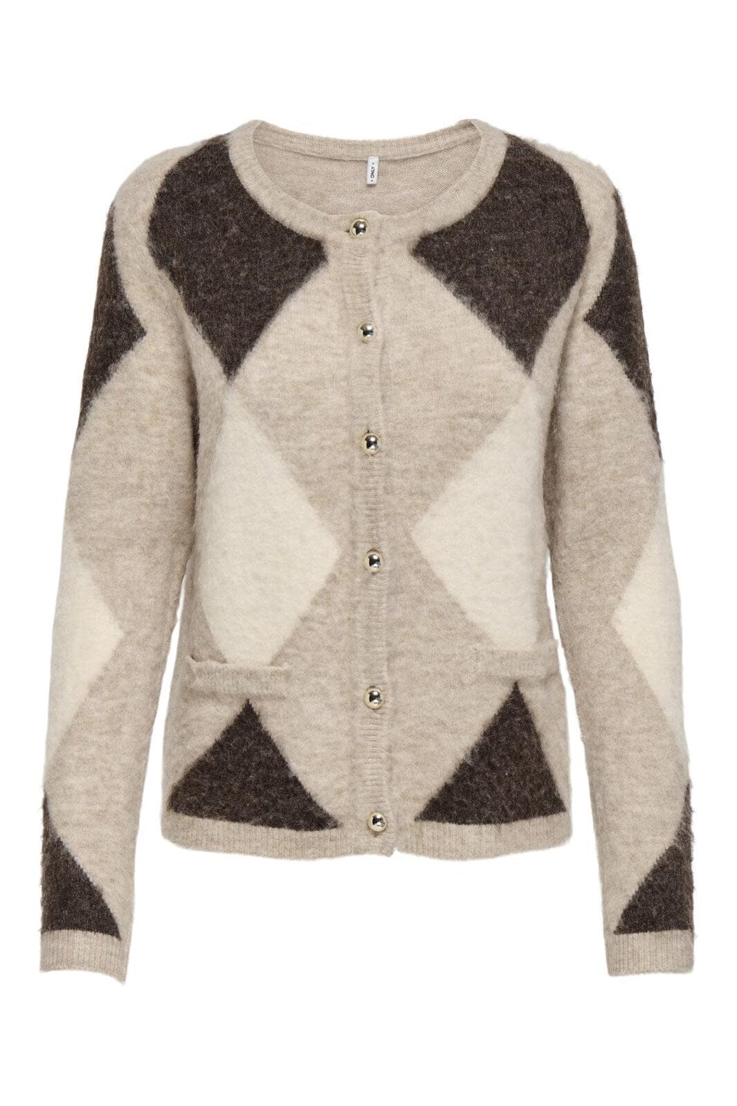 Cardigan de Only avec un motif géométrique dans des nuances de brun et de beige. Il a un col rond, des manches longues et des poches latérales. Des boutons dorés ornent le devant.